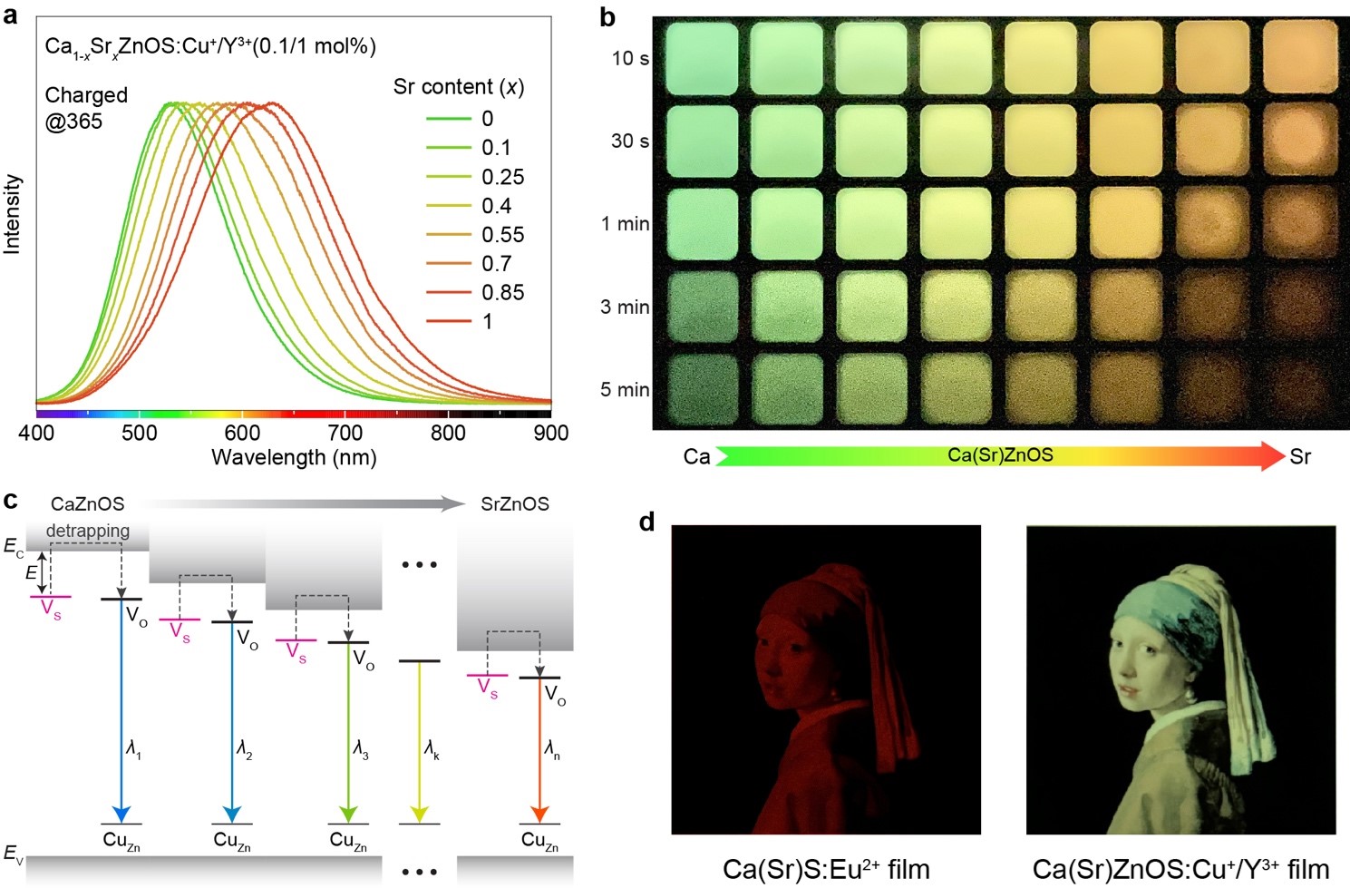 Figure 1. Continuous tuning of PersL Wavelength in Ca(Sr)ZnOS:Cu+/Y3+. a, PersL spectra of Ca1-xSrxZnOS:0.1%Cu+/1%Y3+ (x = 0−1) after turning off the UV charging light (4 W, 365 nm). b, PersL photographs of Ca(Sr)ZnOS:0.1%Cu+/1%Y3+ with various Sr contents. c, Band diagram illustration of the PersL mechanism. EC and EV refer to the energy of conduction band minimum and valence band maximum, respectively. d, Multicolor display through PersL film containing blended Ca(Sr)ZnOS:Cu+/Y3+ crystals in the presence of a patterned filter, which shows overwhelming color resolvability compared to the PersL film comprising conventional Ca(Sr)S:Eu2+.