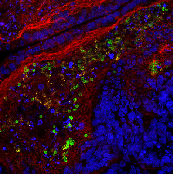 Our eureka moment came early on when we noted a gp15 signal, which was also positive for Sporo-glo (both marking the intracellular stages of the parasite) already at 6 hours post injection. Within 24 hours, the injected oocysts had released their sporozoites which invaded epithelial cells and formed trophozoites. These then developed into the Meront I stage with 8 merozoites. What followed was a series of “marathon micro-injections” to visualize various stages at different time points.