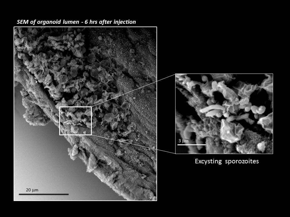 The sexual stages – microgamonts and macrogamonts – could be seen 72-120 hours after injection and at about 120-172 hours post injection, we found the organoid lumen full of newly generated oocysts. All these stages were visualized using 3 different techniques. Immunofluorescence (IF) imaging was first performed to detect the presence of parasite at different time points and ascertain the time from injection to formation of new oocysts. Scanning electron microscopy (SEM) was used to visualize the interior apical surface of the organoids infected with parasite. Long microvilli covering the parasite were clearly visible. Transmission electron microscopy (TEM) allowed us to see the internal parasite structure much more precisely and thus helped us characterize the stages at each time point. With the confirmation that the organoid was providing amenable conditions for the parasite to complete its whole life cycle, another question arose – are these new oocysts actually functionally active and infectious? At this point our expert parasitologist collaborators came to our rescue and helped us perform an elegant mouse assay which would confirm just that. Neonatal mice, which are susceptible to Cryptosporidium infection, were fed sporozoite injected organoids collected at different time points post-inoculation. Histological analysis of the mice intestines confirmed that infection occurred only in mice which were fed the day 5 organoids (which would have the newly generated oocysts), while the day 1 organoids (with intracellular stages but no newly generated oocysts) failed to produce any infection. Using an oocyst specific antibody, we could also isolate the newly generated oocysts from the organoid lumen.