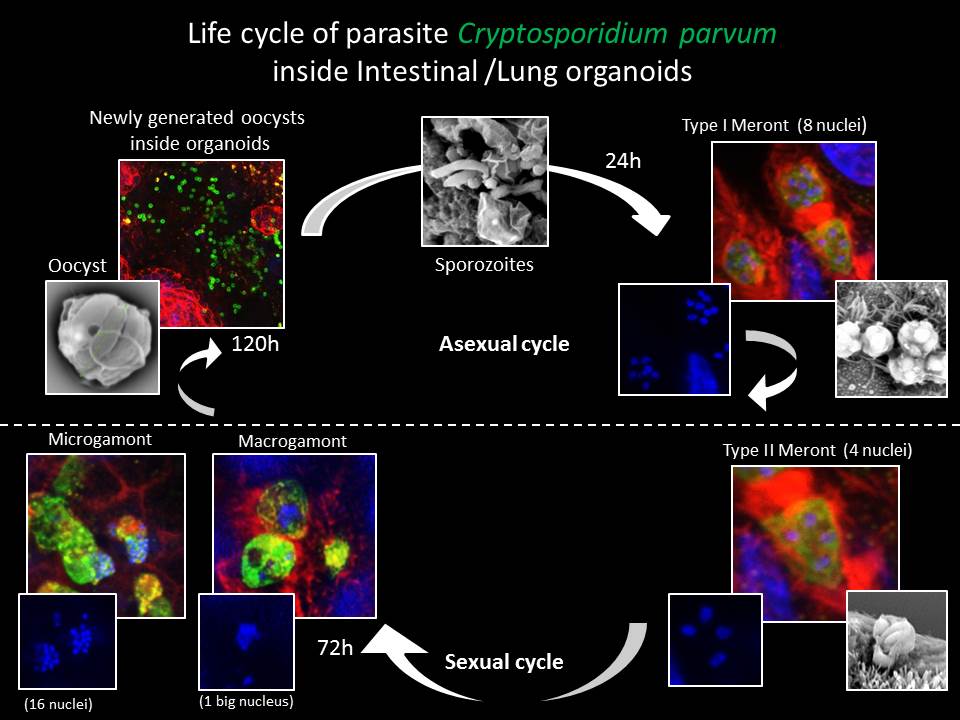To our knowledge, our study is the first to use small intestinal and lung organoids to study the whole life cycle of Cryptosporidium parvum. Our long -term assay confirmed that the parasite could be grown in the organoids for at least 21 days, which provides a great opportunity for researchers to study the host-microbe interaction of the parasite in more detail. This proof-of-concept study demonstrates that organoids can be useful for studying infectious diseases affecting various organs of the human body. In the future, a co-culture system incorporating immune cells with the epithelial organoids should enable testing immune responses occurring within the body in response to pathogenic infections. Furthermore, in the case of intestinal infections such as Cryptosporidium, co-culture experiments with microbiota will provide insights into pathogen-microbiome interactions. We envision that this study will open various new avenues in the field of host-microbe interactions.