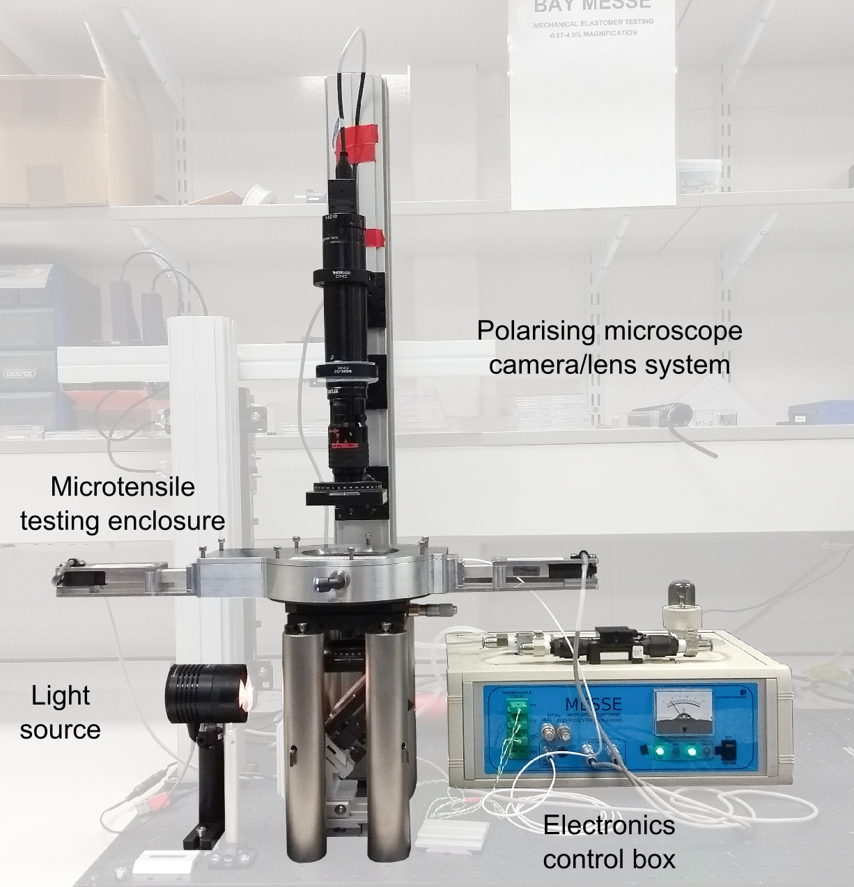 Characterising the mechanical behaviour of our new LCE and comparing it against existing LCEs was my next task. It has long been known that when you strain a LCE you can affect the ordering of liquid crystal molecules contained within – indeed the orientation of the LC director relative to the strain axis, and how the liquid crystal ordering changes with strain is fundamental to the unique and sometimes conflicting mechanical properties of LCEs. When reviewing the literature we were therefore surprised to find few articles that published, for a given material, both the tensile mechanical behaviour and how the LC ordering and director orientation changed with strain. Moreover, we could find only two papers (the pioneering papers by Küpfer and Finkelmann) where the tensile mechanical behaviour and LC ordering/director response were simultaneously measured.[5,6]