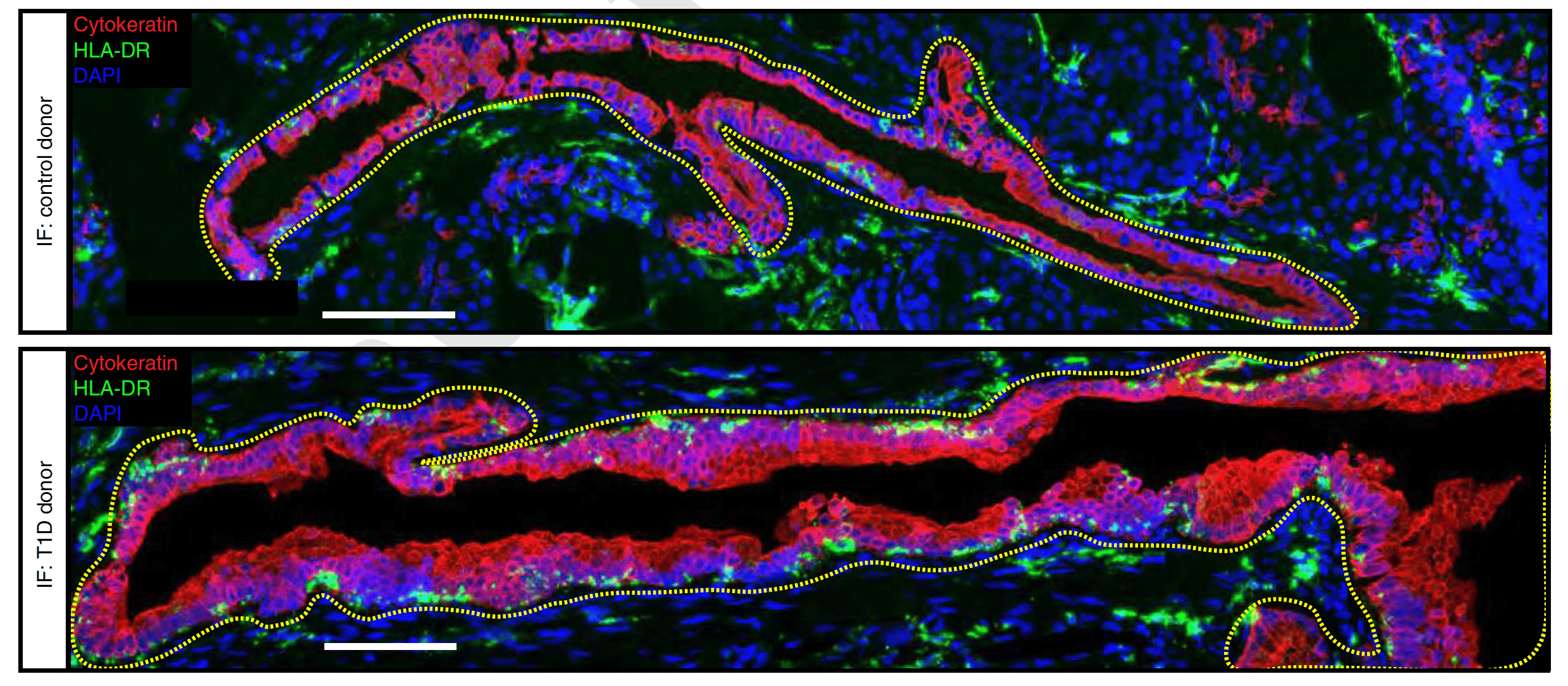 From Figure 5i of the paper: Representative confocal microscopy images from the pancreas of a control donor (top) and T1D donor (bottom) displaying HLA-DR+ Cytokeratin+ cells labelled by immunofluorescence (IF; control, n = 3; T1D, n = 2; Cytokeratin is a ductal cell marker; HLA-DR is an MHC Class II cell surface receptor).