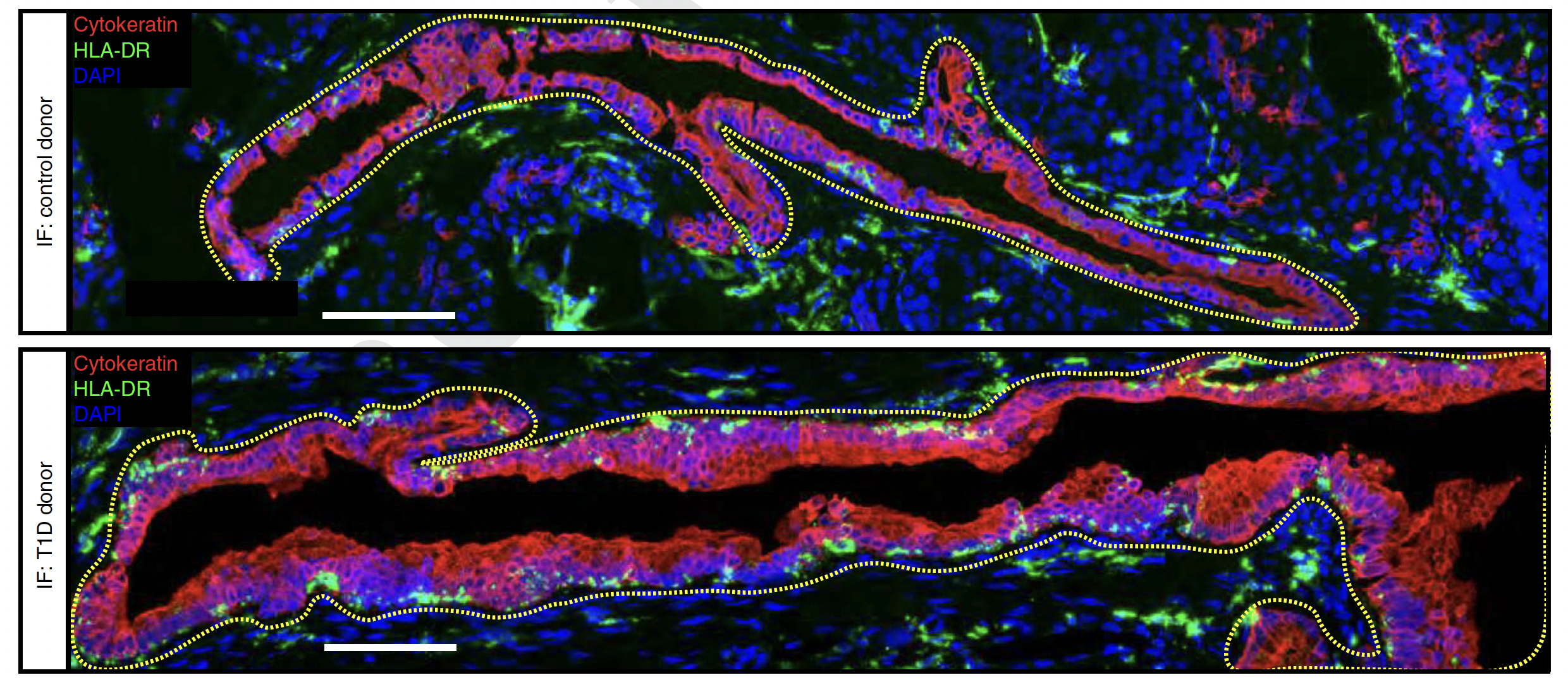 From Figure 5i of the paper: Representative confocal microscopy images from the pancreas of a control donor (top) and T1D donor (bottom) displaying HLA-DR+ Cytokeratin+ cells labelled by immunofluorescence (IF; control, n = 3; T1D, n = 2; Cytokeratin is a ductal cell marker; HLA-DR is an MHC Class II cell surface receptor).