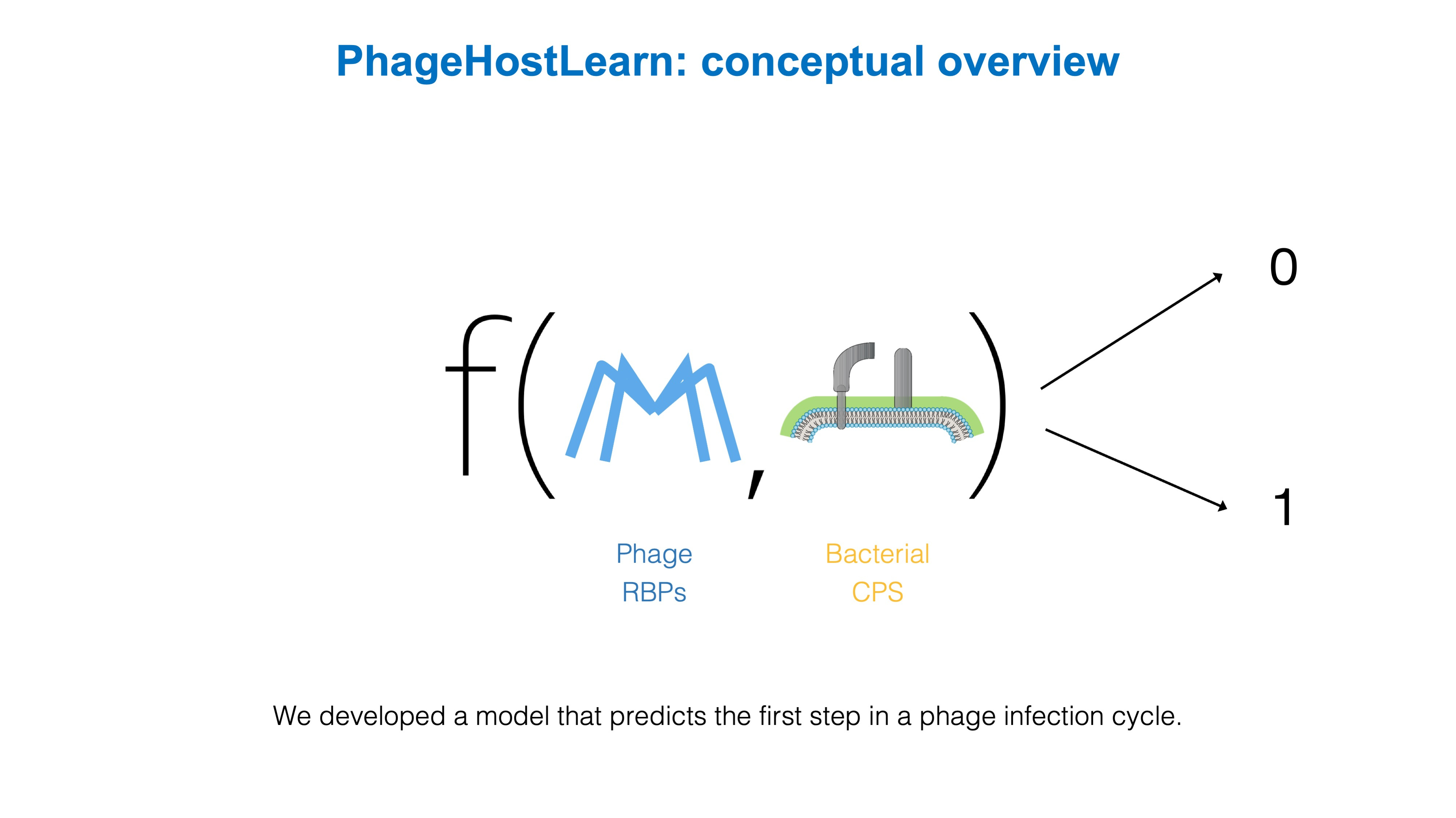 So that's what we did. We have developed PhageHostLearn, a model that can predict Klebsiella phage-host interactions at the strain level, and which provides the predictions in a very practical output format as a ranking of phages to test against a particular bacterium. Specifically, we have focused on the very first step of an interaction between a phage and a Klebsiella bacterium: when the phage touches the surface of the bacterial host and interacts with proteins and other surface receptors. For Klebsiella phage-host interactions, this if often the most important step in the phage's infection cycle. Correspondingly, we have trained our model by giving it the specific proteins involved at both the bacterial side (the CPS surface receptors) and the phage side (the receptor-binding proteins or RBPs).