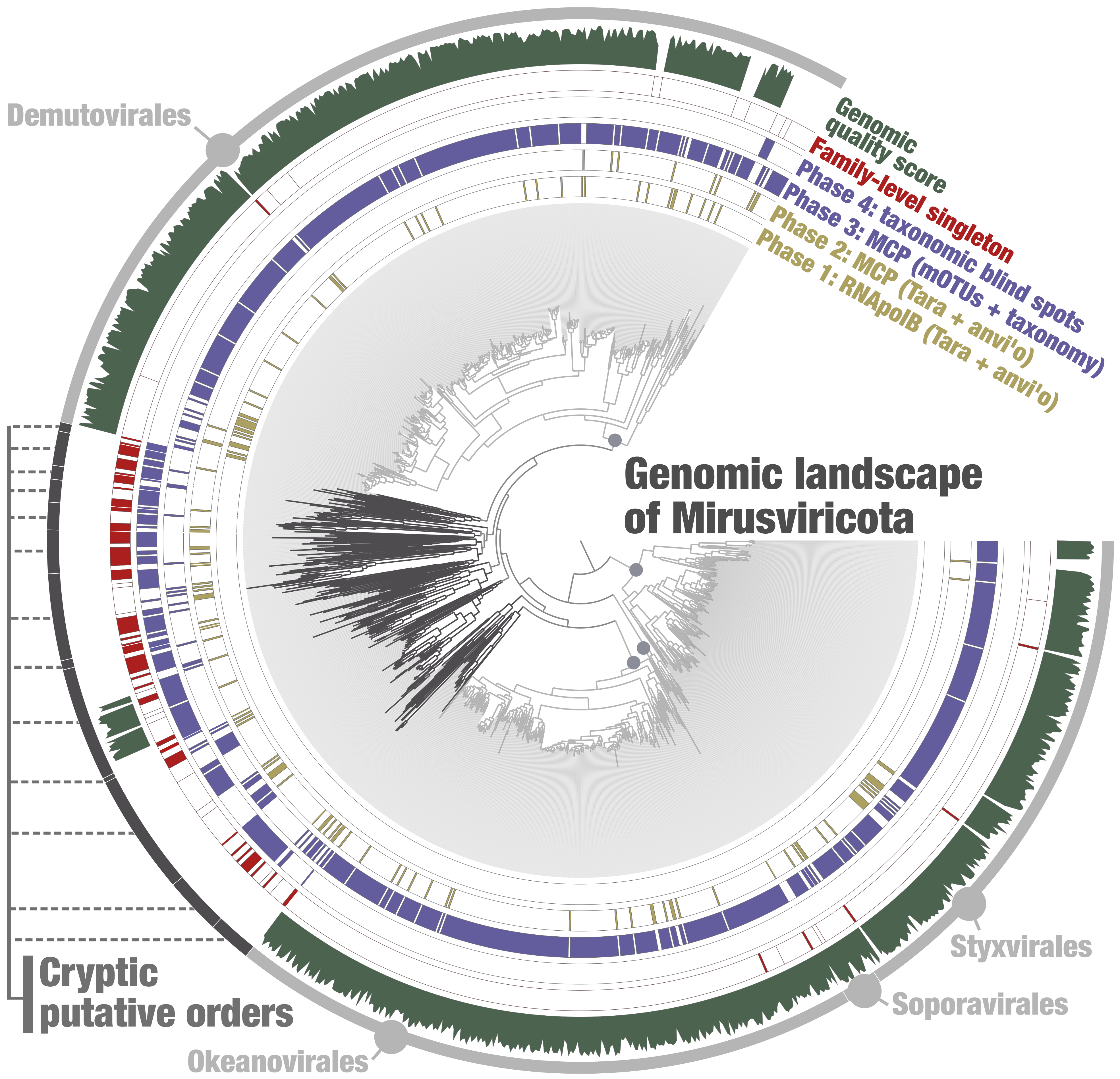 Figure 1: Four screening phases to recover the genomic landscape of Mirusviricota. Maximum-likelihood phylogenomic tree of 1,204 Mirusviricota genomes based on the concatenation of manually curated alignments of MCP, terminase and portal proteins (1,871 amino acid positions). Details about the tree can be found in the Figure 1 of our Nature Microbiology publication. The four first layers indicate the screening phase origin of genomes present in the final non-redundant genomic database of Mirusviricota. Next layer indicates genomes that are single representatives of a putative family. Finally, the last layer displays the quality score (completion minus redundancy) of genomes for which a single copy core gene collection is available. Selections indicate the major putative orders as well as the cryptic putative orders.
