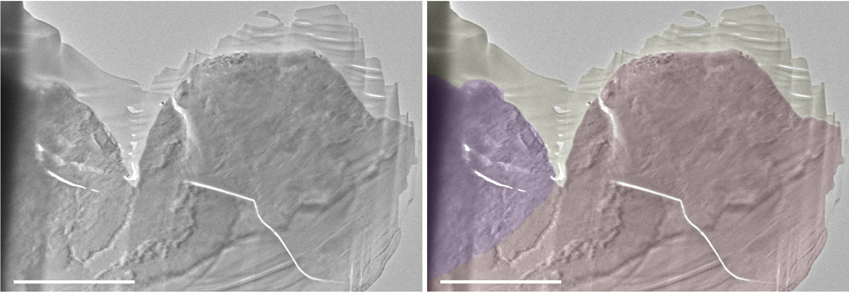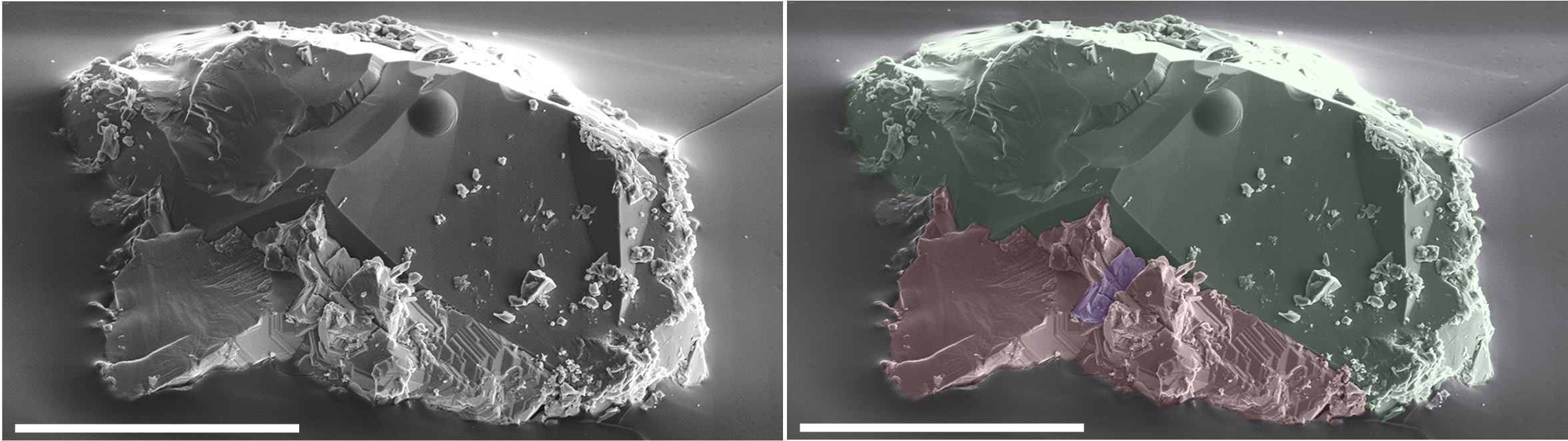 The particles are tiny and challenging to handle, but after a lot of practice (with similarly sized but less precious samples), we mounted them on epoxy stubs to begin our characterization. To study these samples in my lab, we use a series of electron microscopy techniques, starting with looking at the full particle in a scanning electron microscope (SEM) then taking “slices” out of it (using a focused ion beam microscope or FIB) to examine in greater detail and at much finer scales in the transmission electron microscope (TEM). Using the TEM, we can collect signals that tell us about the composition, structure, and oxidation state of a material at scales of a nanometer or less, depending on the material. We ended up using all of those signals to understand this sample.