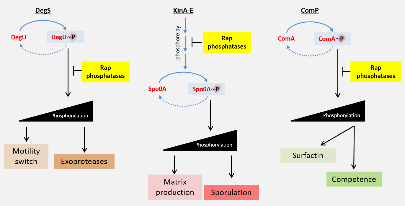 The importance of the Rap-Phr regulatory elements has been investigated by diverse groups, however one problem that became apparent over time was that these phosphatases have redundant regulatory roles, e.g. a strain possessing 4-5 Rap phosphatases all controlling Spo0A would not be rare. Since most studies addressed only one or two Rap phosphatases at a time, it was hard to obtain a complete picture of their regulatory effect. Comparison of diverse studies was also complicated by the use of disparate B. subtilis strains. Nevertheless, in recent years it became clear that these phosphatases were important for ecological adaption and phenotypic control in B. subtilis. An isolate from chicken guts was shown to sporulate extremely early as compared to lab strains, with these differences being underpinned by variation in their available Rap-Phr pairs. Another study showed that a particular Rap-Phr pair was important for biofilm formation, which would have an impact on further phenotypic differentiation.