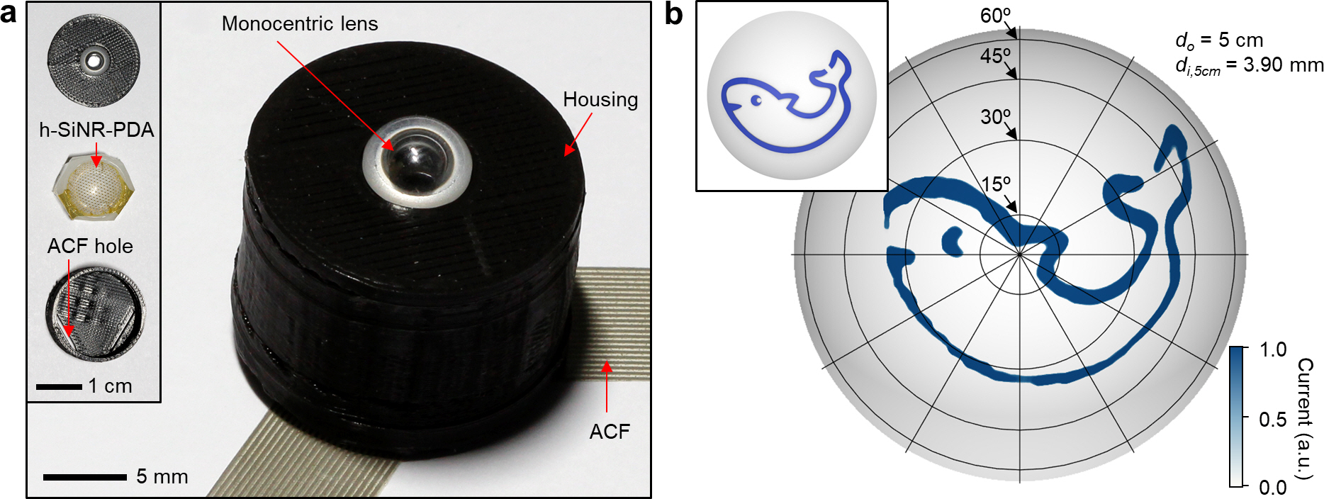 In our recent publication, we have reported a novel wide FoV imaging device inspired by the natural aquatic eye. The developed device features the FoV of 120°, a miniaturized form factor, minimal optical aberrations, the DoF between 20 cm and infinity, and the facile visual accommodation. Specifically, we developed a core-shell-type monocentric lens with two distinct RI values for the core and shell respectively (Fig. 2a). It shows comparable optical characteristics to the natural protruding monocentric lens. We also developed a hemispherical silicon nanorod photodiode array, whose shape matches the hemispherical focal plane formed by the monocentric lens (Fig. 2b). It shows outstanding imaging performances even under vignetting due to its sensitive photodetection owing to the nanorod-type texturing and surface passivation. These optical and device components including a built-in aperture were integrated in a customized housing (Fig. 3a). The aquatic-vision-inspired camera successfully captured the images from wide angular directions and at various distances (Fig. 3b).