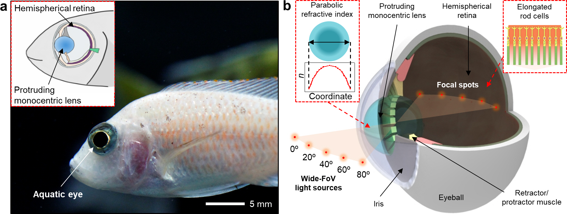 Figure 1. Structural and functional features of the aquatic vision in nature: (a) Photograph of the aquatic eye; (b) Schematic illustration of the aquatic eye with its key features.