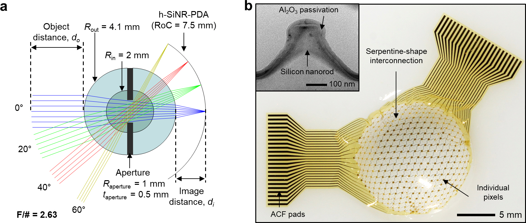Figure 2. Optical and device component: (a) Schematic illustration of a monocentric lens; (b) Photograph of a hemispherical silicon nanorod photodiode array. The inset shows a cross-sectional TEM image of the silicon nanorod.