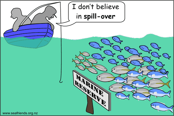 Fishing pressure on MPA borders can mask fish spillover and degrade marine populations within MPA peripheries. Illustration copyrights: Dr. J Floor Anthoni, www.seafriends.org.nz