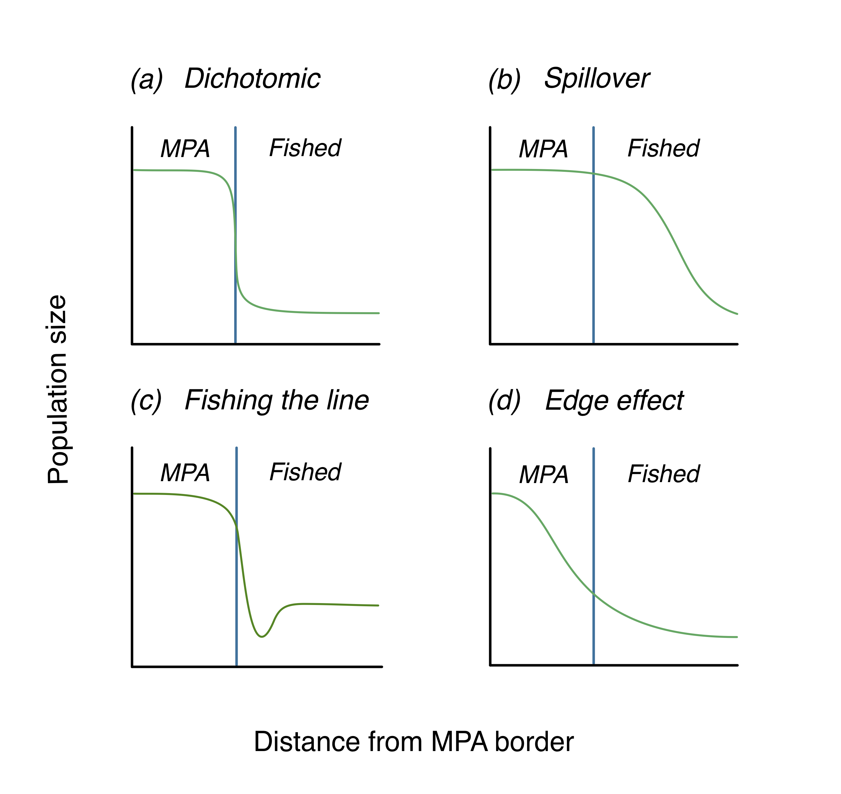 Figure 1: Hypotheses for spatial patterns of marine populations across MPAs boundaries. (a) Dichotomic, (b) Spillover, (c) Fishing the line, (d) Edge effect.
