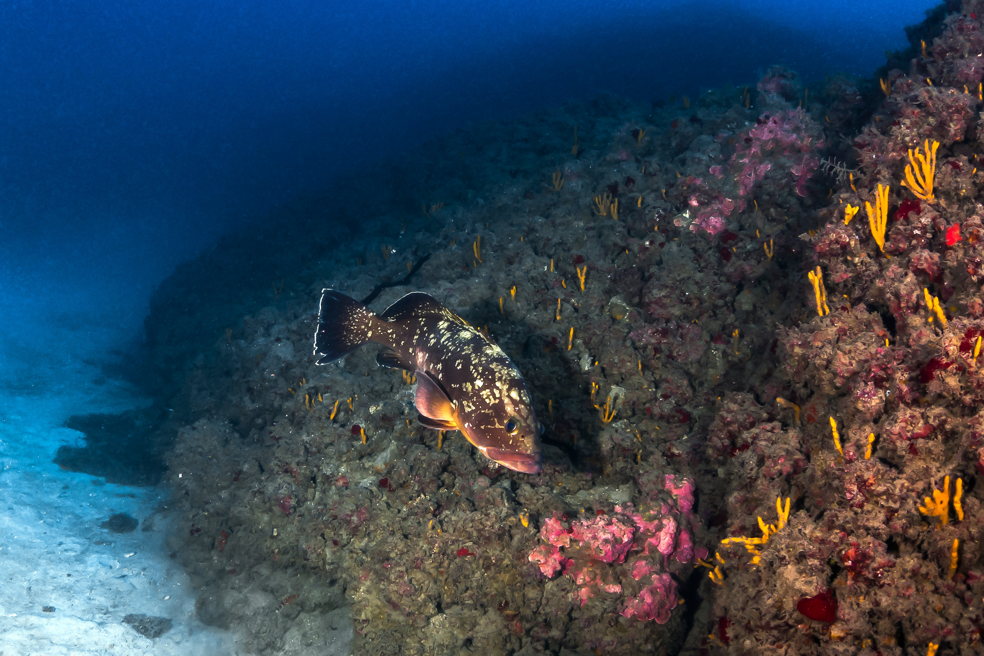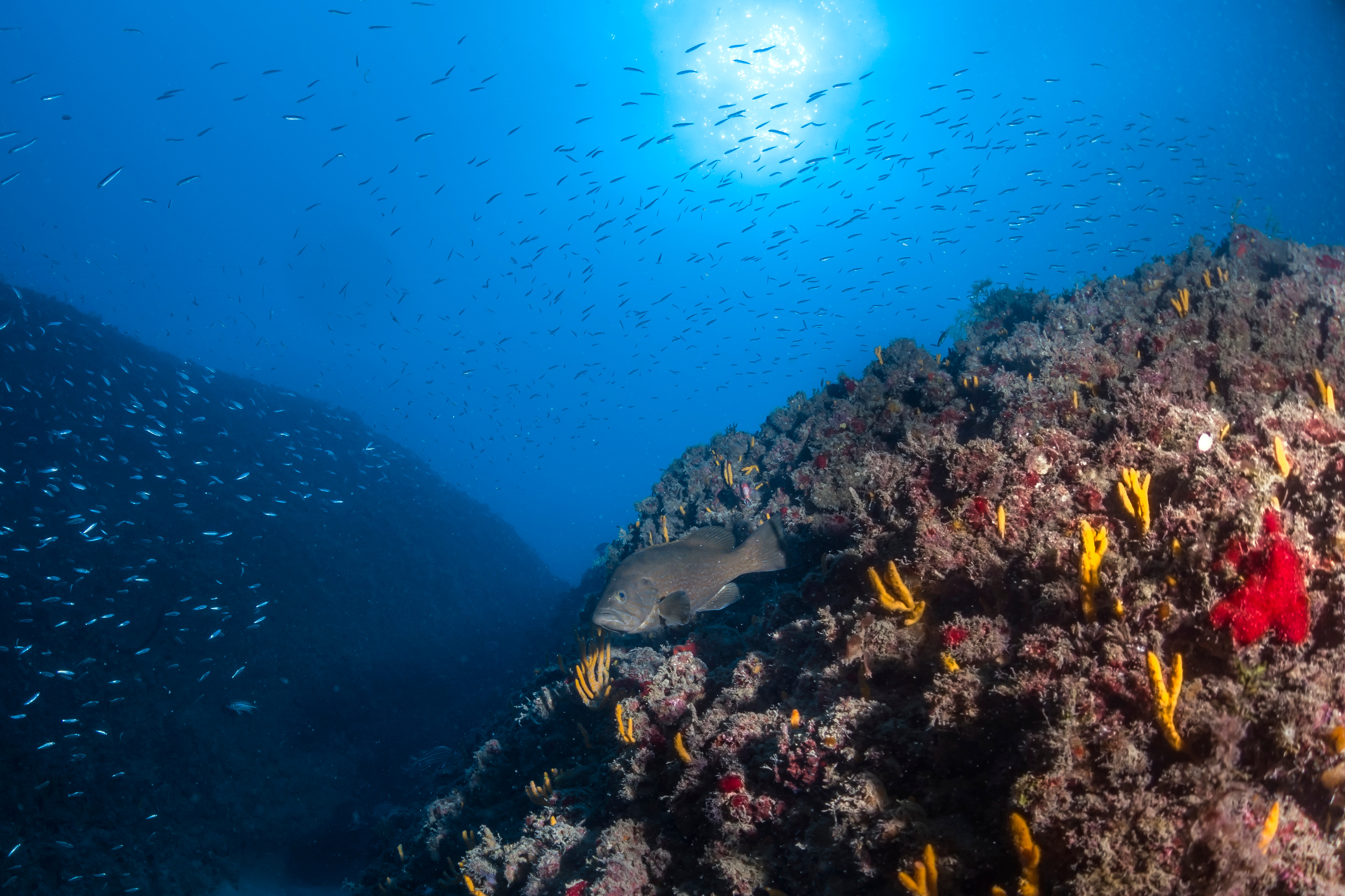 A large grouper (Mycteroperca rubra) and a school of sardines in a healthy Mediterranean rocky reef. Photo was taken at Yam Rosh Hanikra, a no-take Marine Protected Area in Israel. Photo credit: Dr. Shevy Rothman.