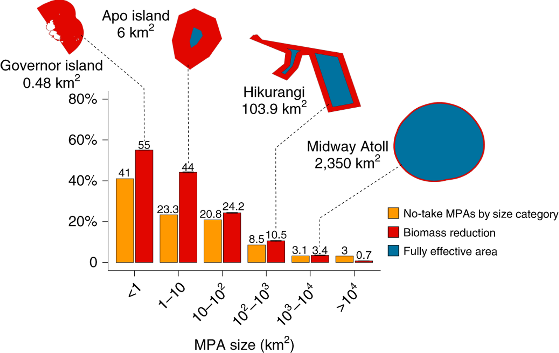 Using the MPAtlas database, we also found that 40% of the no-take MPAs in the world are smaller than 1 km2, meaning that they most likely experience edge effect over their entire area! Overall, 64% of no-take MPAs are smaller than 10 km2 and may hold only about half (45-56%) of the population size implied by their area, making the global no-take MPA network significantly less beneficial than perceived.
