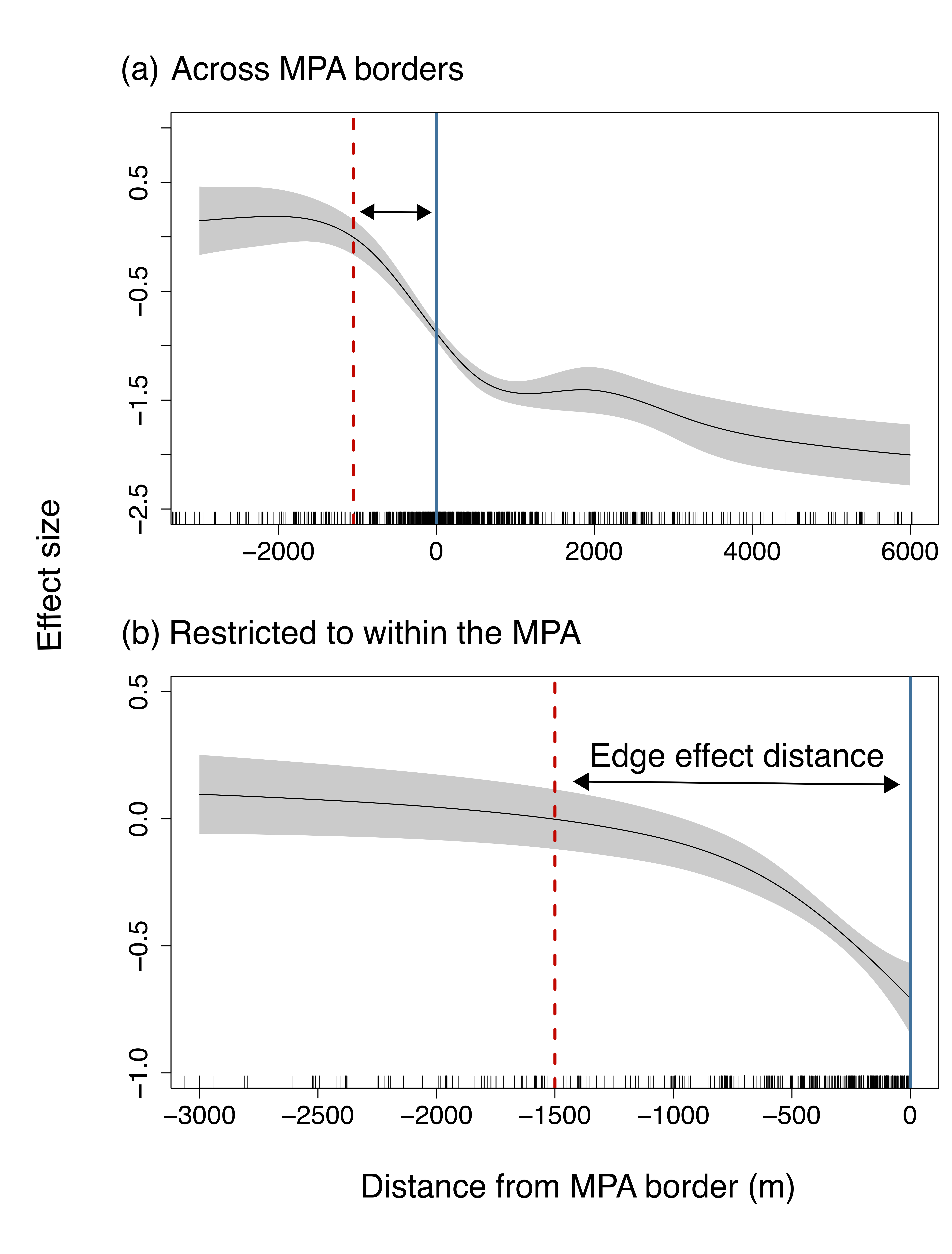 Our study not only revealed strong edge effect in MPAs, but also quantified the magnitude of this phenomenon on a global scale. The results suggest that the edge effect can reach up to 1-1.5 km within the MPA and that population sizes on the border are 60% smaller relative to the core areas.