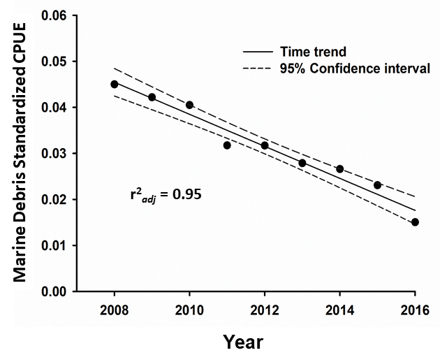 What is driving this apparent decline? It is possible that debris stranding in nearshore waters and on shorelines accompanied by decades of organized removal efforts in the Northwestern Hawaiian Islands may have eliminated some derelict fishing gear from circulation, subsequently reducing the amount available for snagging by longlines. In addition, following the 2011 Tōhoku Japan earthquake and tsunami, over 30,000 fishing boats were lost in Japan. Thus, the total number of active Japanese commercial longline and purse seine vessels targeting the Pacific Ocean has declined substantially. Fewer active fishing vessels means fewer opportunities for lost gear, which may explain to a degree the observed decline. Nonetheless, with these data, we could not definitively identify the causes of the decline over time detected by our model.