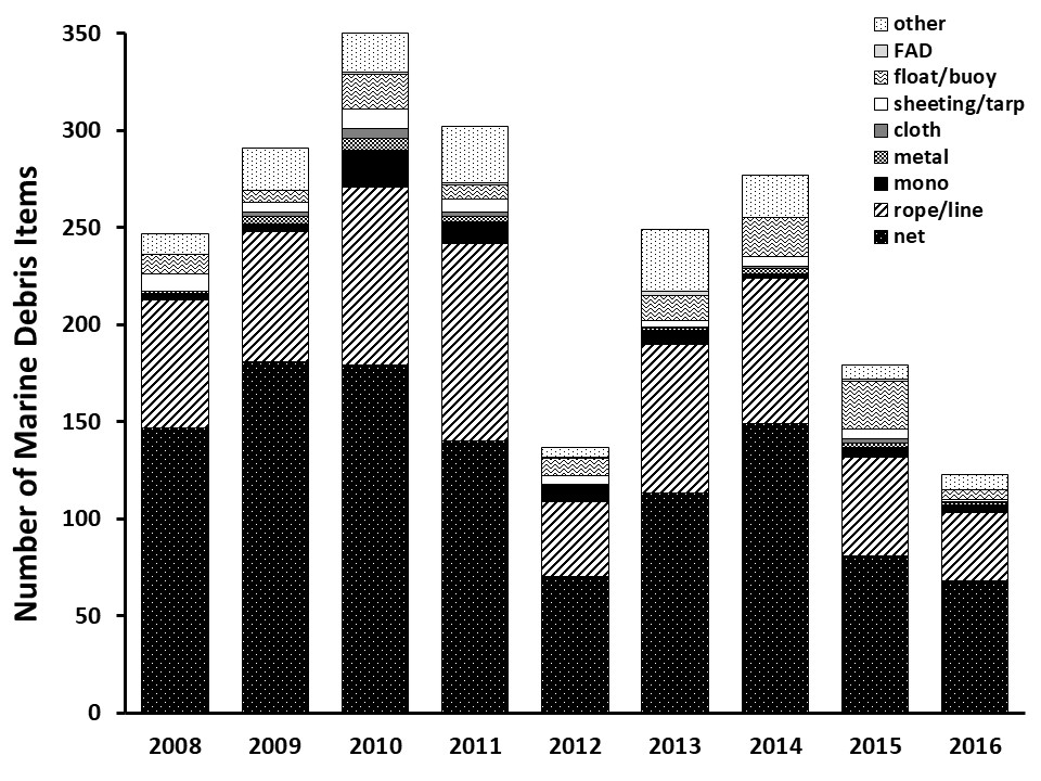 This study was a collaboration between the NOAA Marine Debris Program, the NOAA Pacific Islands Fisheries Science Center, and Walsh Analytical Service. We appreciate the hard work of the Hawai’i longline fishery observers to collect these important data. The results of this study were recently published in the journal Scientific Reports and may be accessed here: https://www.nature.com/articles/s41598-020-64771-1.