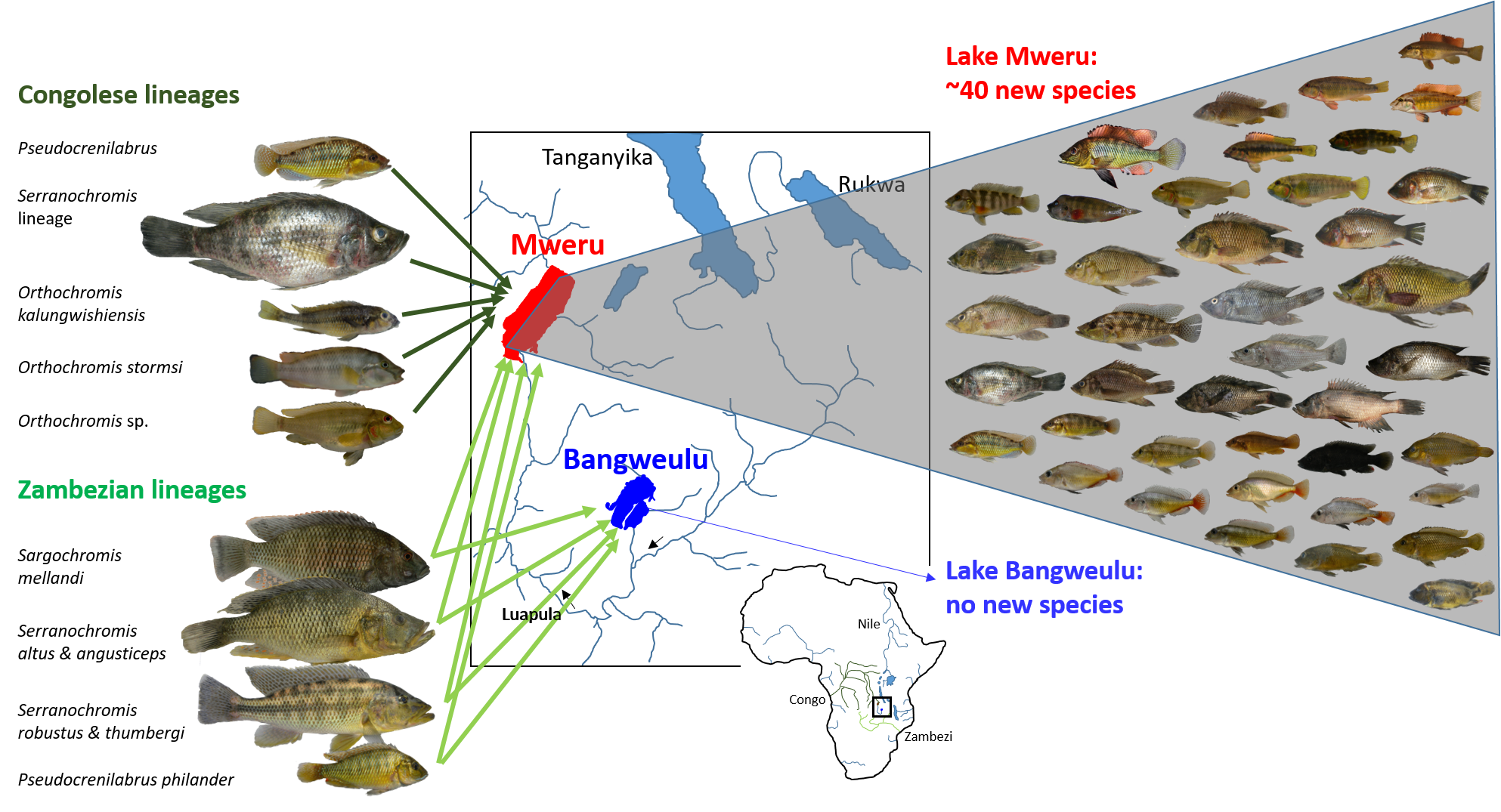 The diversity that evolved in Lake Mweru in less than a million years is fascinating, but why are there no new species in Lake Bangweulu? One important difference between Lake Mweru and Lake Bangweulu is that all Lake Mweru radiations are of hybrid origin, whereas none of the Lake Bangweulu lineages show any evidence of hybridization. This is likely due to the unique geological conditions of these two lakes. Whereas Lake Bangweulu contains almost only Zambezian fish lineages, Lake Mweru’s originally Congolese fish fauna got enriched by Zambezian lineages about a million years ago when the two lakes got connected. Waterfalls and rapids impair the upstream movement of Congolese fishes into Lake Bangweulu but allow downstream colonization of Lake Mweru by Zambezian lineages. Our tests of hybridization suggest that when the Zambezian lineages arrived in Lake Mweru, they hybridized with the Congolese lineages. All radiations are of hybrid origin between Congolese and Zambezian lineages and they all evolved around the same time subsequent to the river capture event.