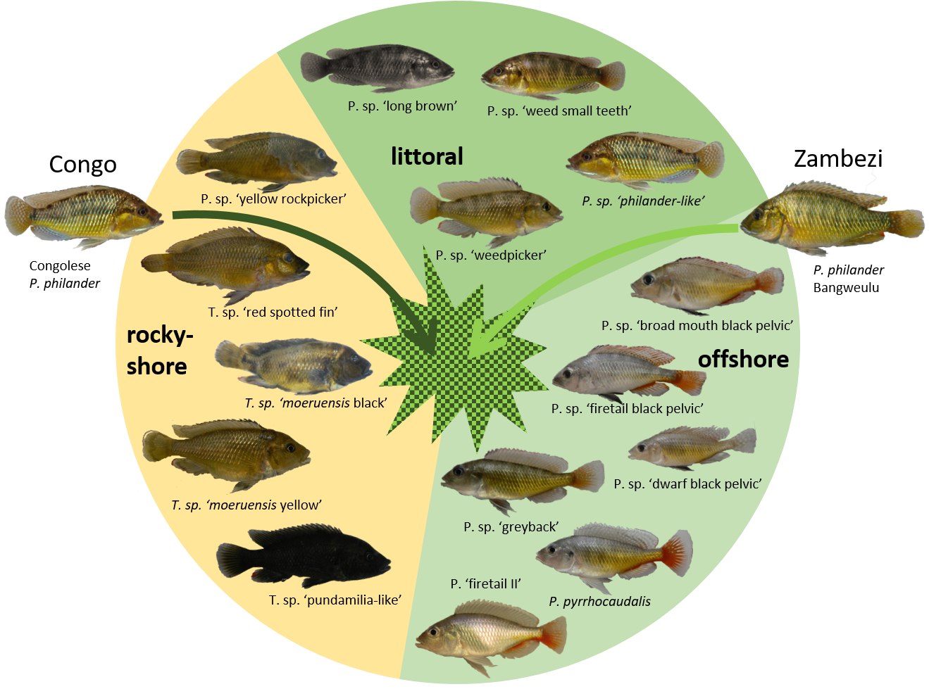 Meier, J. I., D. A. Marques, S. Mwaiko, C. E. Wagner, L. Excoffier and O. Seehausen (2017). Ancient hybridization fuels rapid cichlid fish adaptive radiations. Nat Commun 8: 14363.