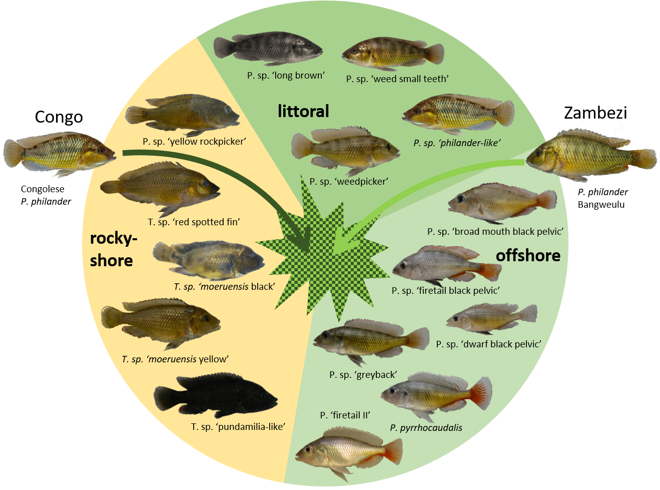 The diversity that evolved in Lake Mweru in less than a million years is fascinating, but why are there no new species in Lake Bangweulu? One important difference between Lake Mweru and Lake Bangweulu is that all Lake Mweru radiations are of hybrid origin, whereas none of the Lake Bangweulu lineages show any evidence of hybridization. This is likely due to the unique geological conditions of these two lakes. Whereas Lake Bangweulu contains almost only Zambezian fish lineages, Lake Mweru’s originally Congolese fish fauna got enriched by Zambezian lineages about a million years ago when the two lakes got connected. Waterfalls and rapids impair the upstream movement of Congolese fishes into Lake Bangweulu but allow downstream colonization of Lake Mweru by Zambezian lineages. Our tests of hybridization suggest that when the Zambezian lineages arrived in Lake Mweru, they hybridized with the Congolese lineages. All radiations are of hybrid origin between Congolese and Zambezian lineages and they all evolved around the same time subsequent to the river capture event.