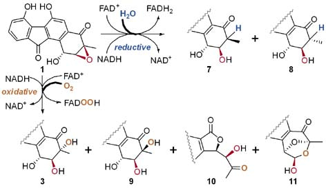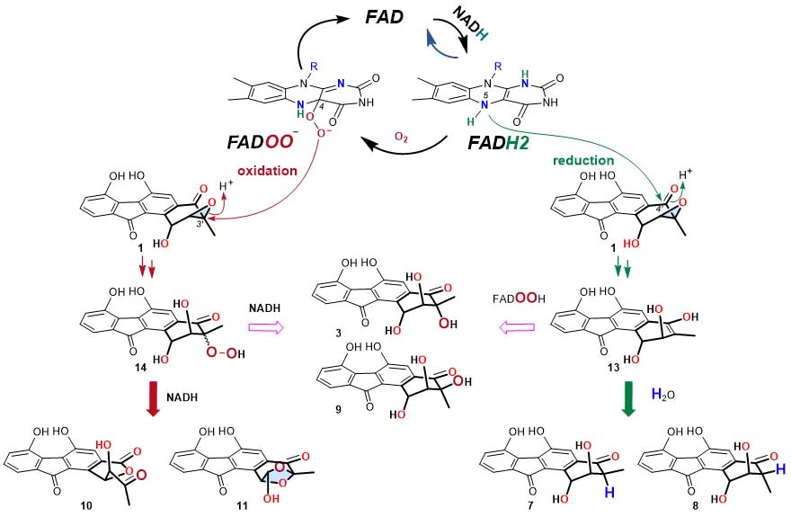 We have previously demonstrated that the epoxide hydrolase Alp1U from the kinamycin biosynthetic pathway can catalyze non-regioselective epoxide ring opening reactions of FST C (1) at either C-2 or C-3 to afford two trans-vicinal products. However, the Alp1U homologue FlsH from the FST biosynthetic pathway was inactive in performing epoxide hydrolyzing reaction of 1. In contrast, FlsH was characterized as a deacylase. We initially hypothesized that FlsH might require a protein-partner or an exogenous cofactor to assist the epoxide hydrolysis reaction. Indeed, incubation of 1 with FlsH and Fre (flavin reductase of E. coli origin) in the presence of NADH led to multiple products. However, it was evaluated that flavin reductase alone was able to mediate similar reactions, as well as several non-FST related flavoenzymes. These observations led to the discovery that FAD and NADH are both sufficient and necessary to facilitate the nonenzymatic decomposition of 1 to similar multiple products. Subsequently, the products were structurally characterized to have a single hydroxyl group at C-2 (7 and 8), or a vicinal diol at C-2 and C-3 (3 and 9), or undergoing rearrangement to have a contracted five-membered A-ring (10) or a bridged and expanded seven-membered A-ring (11) (Figure 1). To probe the underlying mechanism, efforts were taken to examine the effects of pH values, D2O labeling, 18O labeling, time-course experiments, the presence and absence of different flavin cofactors and/or NADH.