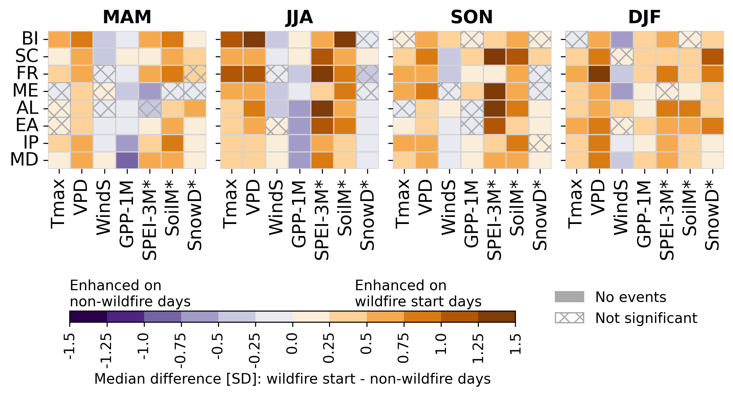 On wildfire days, nearly all variables shift towards conditions that promote fire: It is hotter, drier and vegetation productivity is altered (see Figure 2). However, gross primary productivity (GPP) anomalies reveal distinct seasonal patterns: