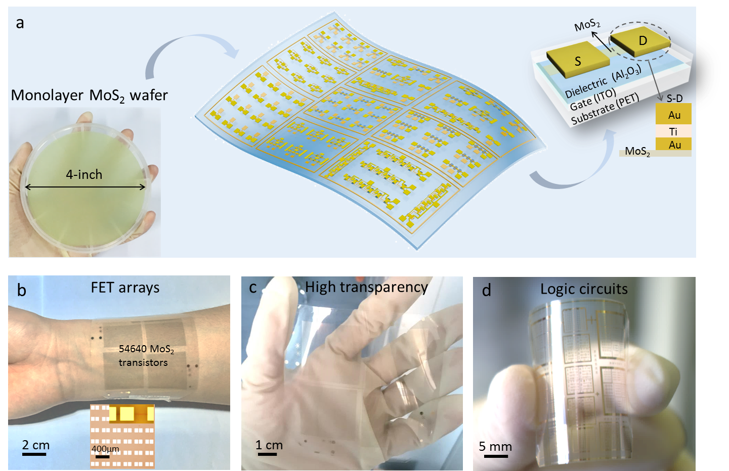 Recently, we design and fabricate flexible electronics based on 4-inch monolayer MoS2 wafers. Those MoS2 wafers were achieved by epitaxy techniques in a multisource chemical vapor deposition (CVD) system. During the growth, substrates were vertically placed in the growth chamber to guarantee source concentration homogeneity along the horizontal direction. Benefiting from the new multisource design and the optimization of the growth process, we successfully realized a high material uniformity across the entire 4-inch wafer and a domain size greater than 20 μm on average.