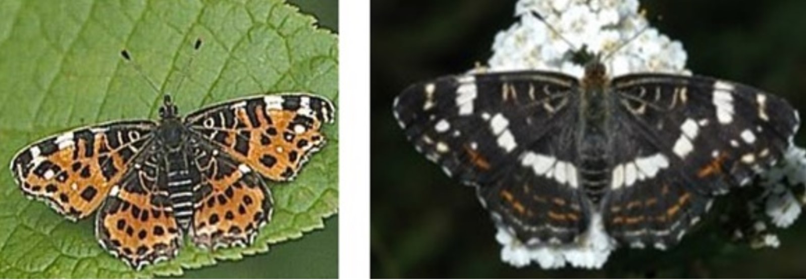 Pictured here are two different seasonal morphs of the expanding Map Butterfly (Araschnia levana). The spring generation is distinctly orange (left), while the summer generation features striking black and white markings (right), demonstrating the species' role as a pollinator. Another example of an expanding butterfly in Northern Europe. Photo credit: Markus Franzén.