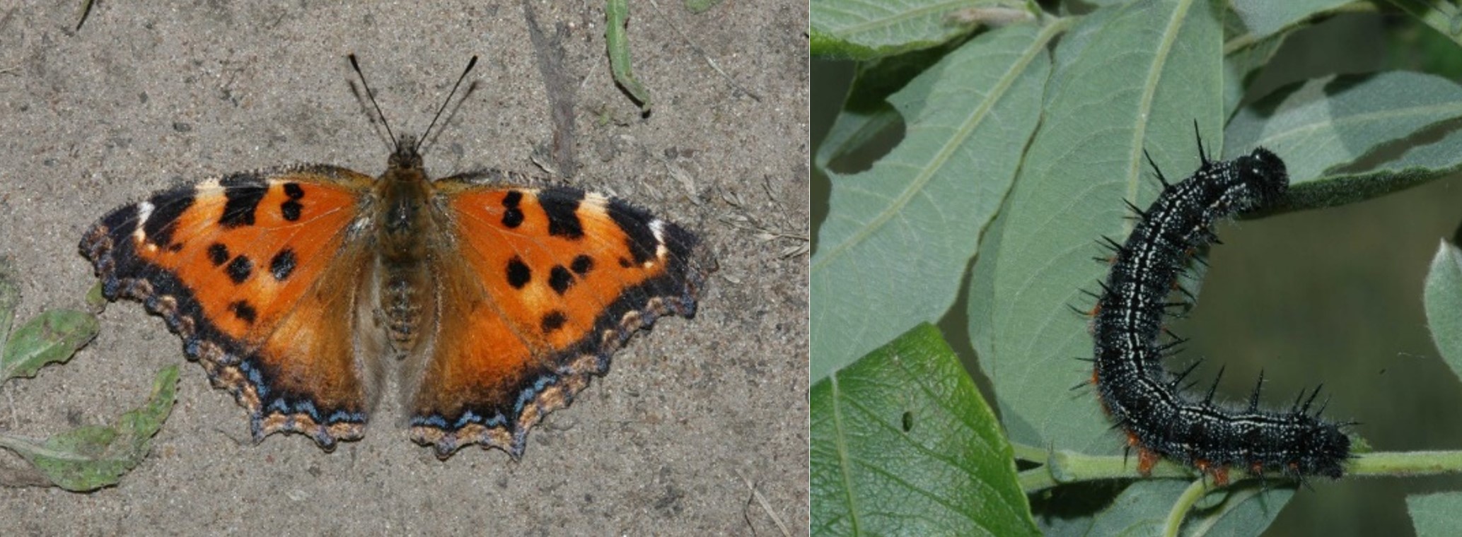 Example of an expanding butterfly in Northern Europe. The adult Scarce Tortoiseshell, or Yellow-legged Tortoiseshell (Nymphalis xanthomelas), showcases its beautiful wings (left), while a caterpillar of the same species feeds on a Willow (Salix species) leaf (right). These images depict the life cycle stages of this species, emphasizing its ecological role as a food resource for birds and a herbivore. Photo credit: Markus Franzén.