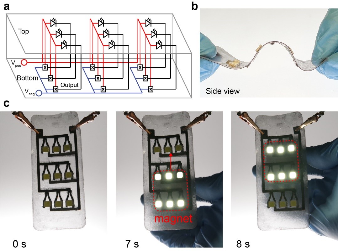 To demonstrate the LM-STAIR technique for creating devices, we fabricated a thin, soft circuit that has different functionalities on different layers. On one layer the device had 9 Hall effect magnetic sensors, and on the other layer 9 LED indicators. These layers were connected with 21 soft vias so that the sensors would sense a magnetic field and then illuminate the LEDs on the other layer (Figure 3). These layers were seamlessly connected with planar interconnects and vias, which were rapidly created through the LM-STAIR technique.