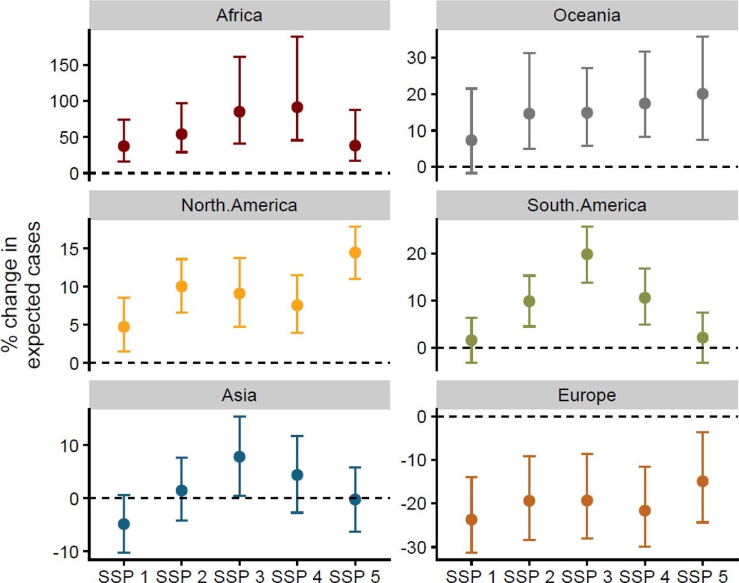 Lastly, the researchers assessed how changes to the expected burden (i.e. number of cases) of ZVBDs across each continent changed under five socioeconomic development scenarios (Shared Socio-economic Pathways (SSPs)), assuming that increased poverty will result in more severe disease outcomes and higher incidence. The model revealed substantial variation in disease burden among continents. Except for Europe, all continents were generally projected to experience a greater disease burden under all five (SSP) scenarios. Africa showed the largest increases (25-75%), followed by Oceania and the Americas (5-20%).