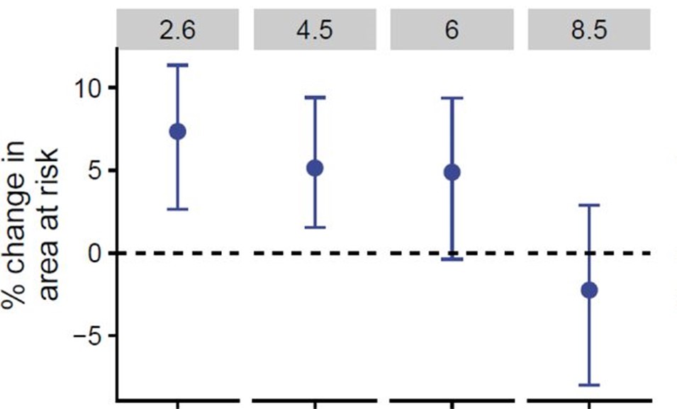 Under a ‘medium’ climate change scenario (RCP = 4.5) projected until 2050, the model showed a 9.6% mean increase in the endemic areas across all 101 ZVBDs, with similar patterns of range expansion found on all continents.