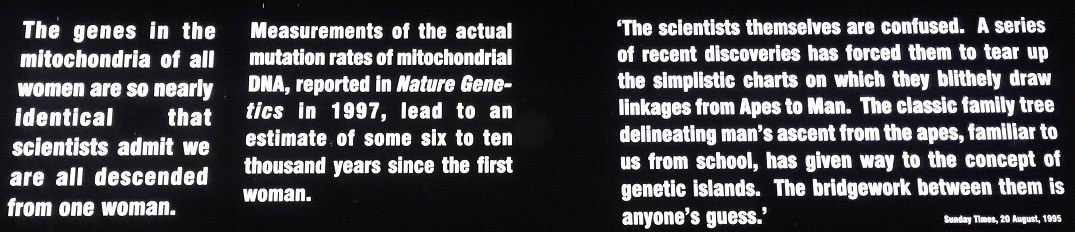 A Nature Genetics paper was cited to argue that we all descend from one woman! I was initially glad that my young ones are not very good readers yet, only to find that each display had an explanatory audio in at least six different languages!