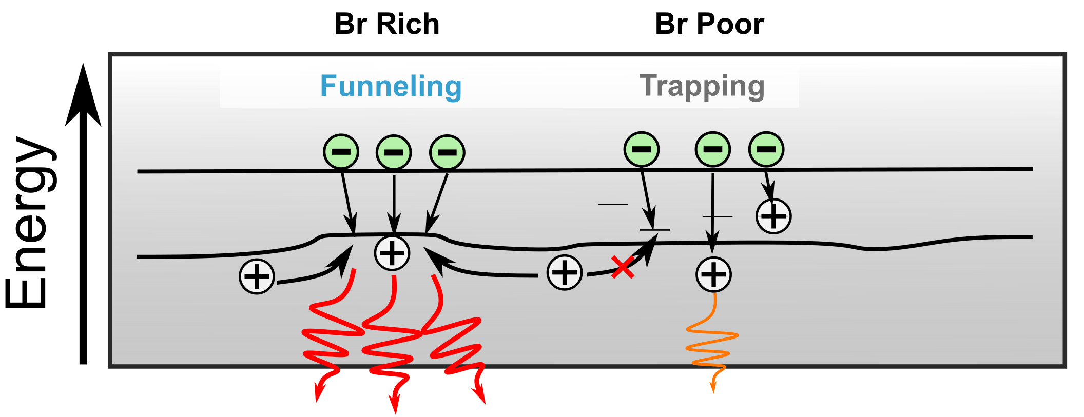 Figure 3: Schematic of our proposed model for the nanoscale energy landscape in alloyed perovskites. Br rich regions have energy gradients which funnel carriers to high quality areas, Br poor regions lack these funnels and so the carriers can more easily be trapped.