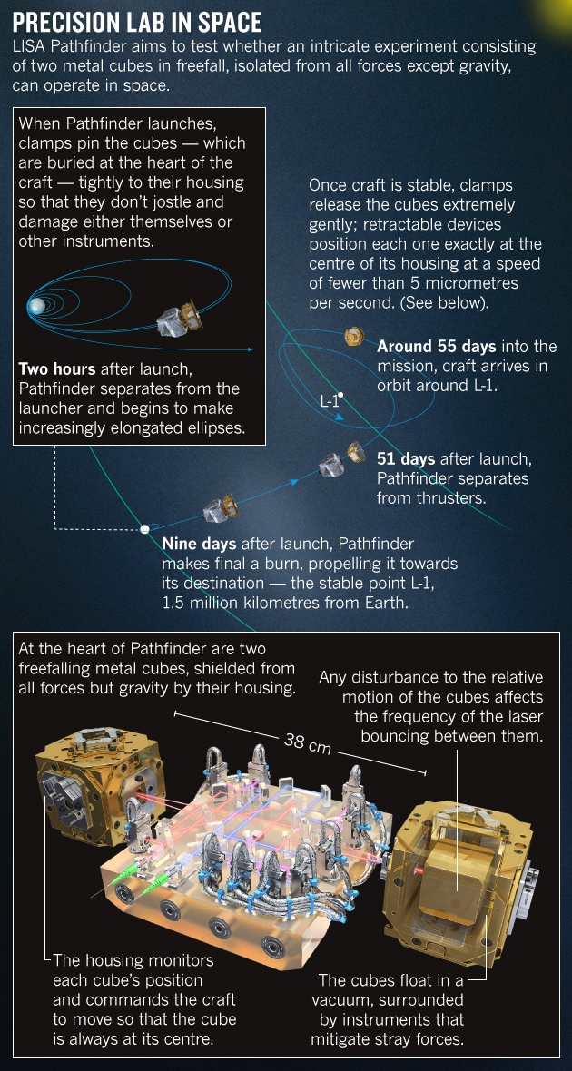 From the time of Pathfinder’s launch from ESA’s spaceport in Kourou, French Guiana, to the end of its subsequent eight-week journey, the masses will stay pinned to their housing deep inside the craft. But on arrival in orbit around a stable point between the Sun and Earth called Lagrange point 1, or L-1, about 1.5 million kilometres away, the cubes will be gently released to float within the spacecraft (see ‘Precision lab in space’).