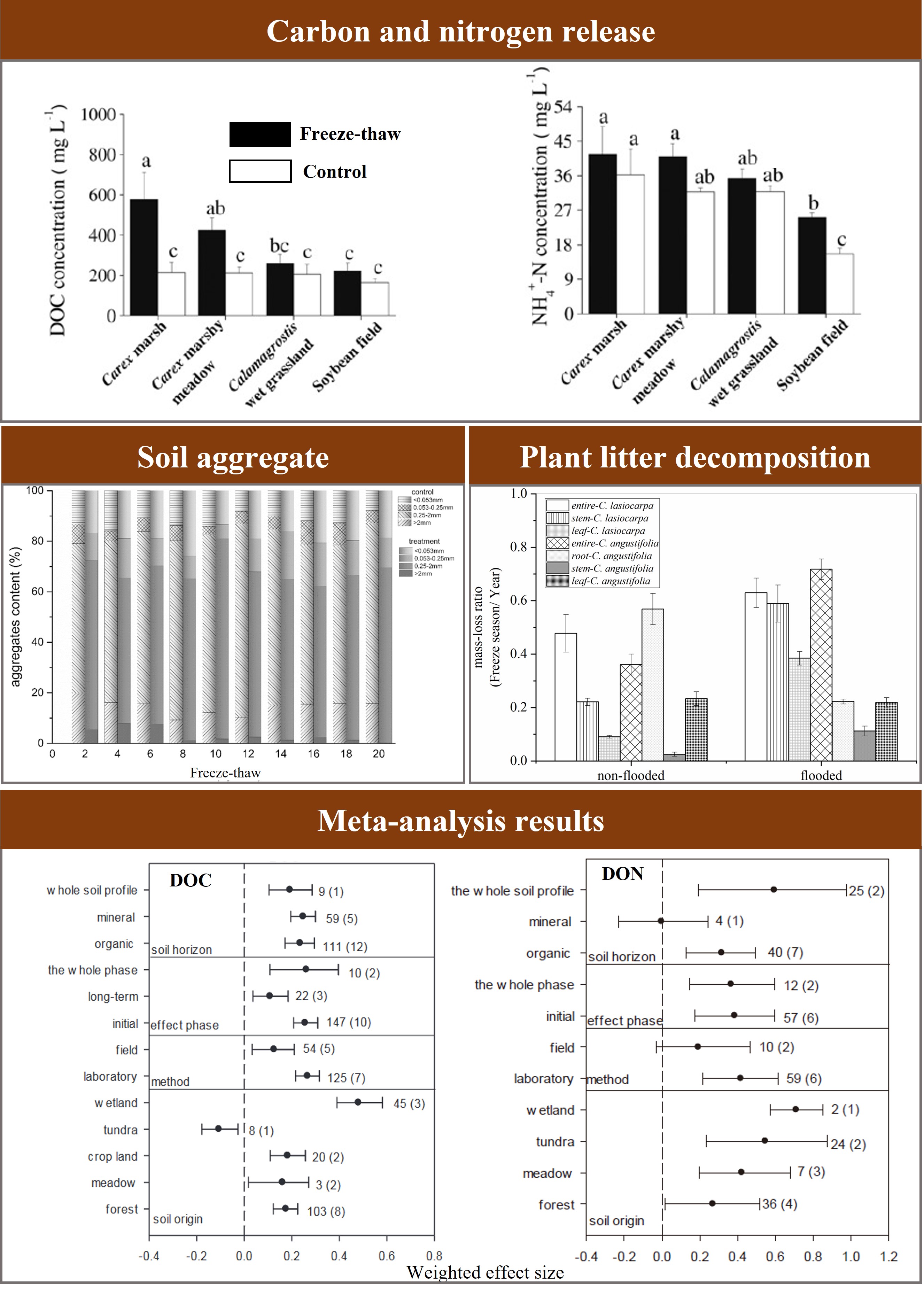 In recent years, our research team has conducted studies on freeze-thaw cycles’ ecological effects on boreal wetlands, which are seen as important terrestrial carbon and nitrogen pools and are susceptible to freeze-thaw cycles. Through case studies, we found that freeze-thaw cycles could prompt substantial releasing of carbon and nitrogen, change the migration of nutrients 1, 2, 3, 4, 5, 6, and alter aggregate stability in wetland soil 7. Furthermore, wetland litter decomposition during frozen and freeze-thaw periods accounts for more than half of the annual decomposition 8. Through a meta-analysis, we quantified and compared the effects of freeze-thaw cycles on carbon and nitrogen cycles in different ecosystems and discovered that freeze-thaw cycles prompt wetlands to release more organic carbon and nitrogen than other ecosystems 9 (Fig. 1).