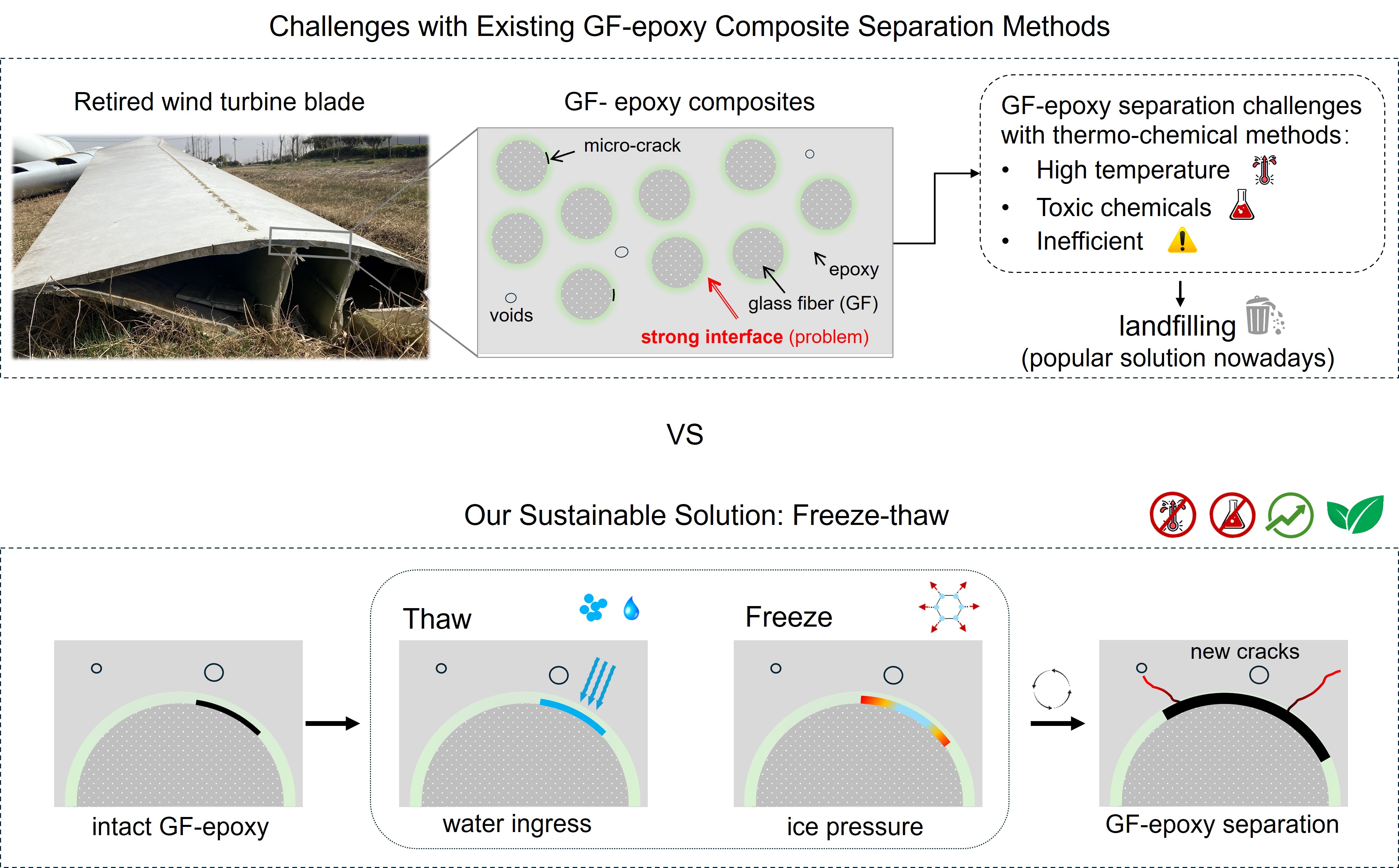 Among various end-of-life (EoL) strategies for decommissioned blades, recycling is widely regarded as the most circular and sustainable option, due to its ability to reclaim glass fibers and resin for potential reuse. Current thermal and chemical methods achieve GF-epoxy separation by breaking the epoxy’s C–O bonds at elevated temperatures or through aggressive chemical treatments. While effective in separating the glass fibers and epoxy, these methods are associated with significant drawbacks, including glass fiber degradation, epoxy dissolution, high energy demand, toxic emissions, and complex wastewater management. These environmental burdens and post-treatment steps reduce the feasibility of large-scale deployment of wind blades.
