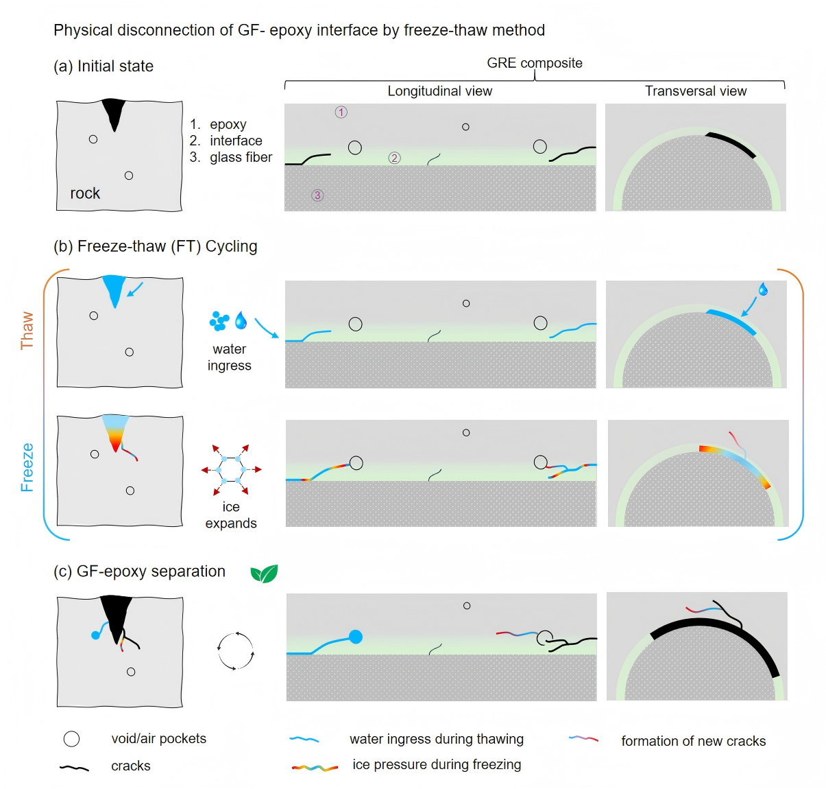We schematically demonstrate how this unique freeze-thaw approach works as shown in Fig. 2. The freeze-thaw method works by infiltrating water into the pre-existing cracks and voids within the epoxy matrix during the thawing phase. Once the water has penetrated these defects, it expands during the freezing phase, exerting mechanical stress at the fiber-resin interface. With each freeze-thaw cycle, the cracks progressively propagate and expand, connecting with nearby voids. This chain reaction causes further stress concentrations, leading to more extensive cracking and eventual debonding of the glass fibers from the resin.