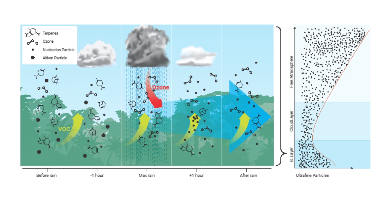 Rainfall events significantly alter trace gas concentrations just above the canopy and produce bursts of nucleation particles that grow into the size range above 40 nm by early morning the next day. Figure 1 presents a schematic representation of the gas-aerosol processes occurring during and after rainfall events. The main nucleation particle bursts occur together with ozone (O3) injections into the understory. The maximum concentration of both particles and O3 occurs about 30 minutes after the precipitation peak. The evolution of trace gas concentrations from the time before the onset of rain up to 2 hours after the maximum precipitation suggests that the particle burst is produced by the reduction of the condensation sink and reactions involving O3, terpenes and NOx. Sesquiterpenes are likely to play a major role in new particle formation.