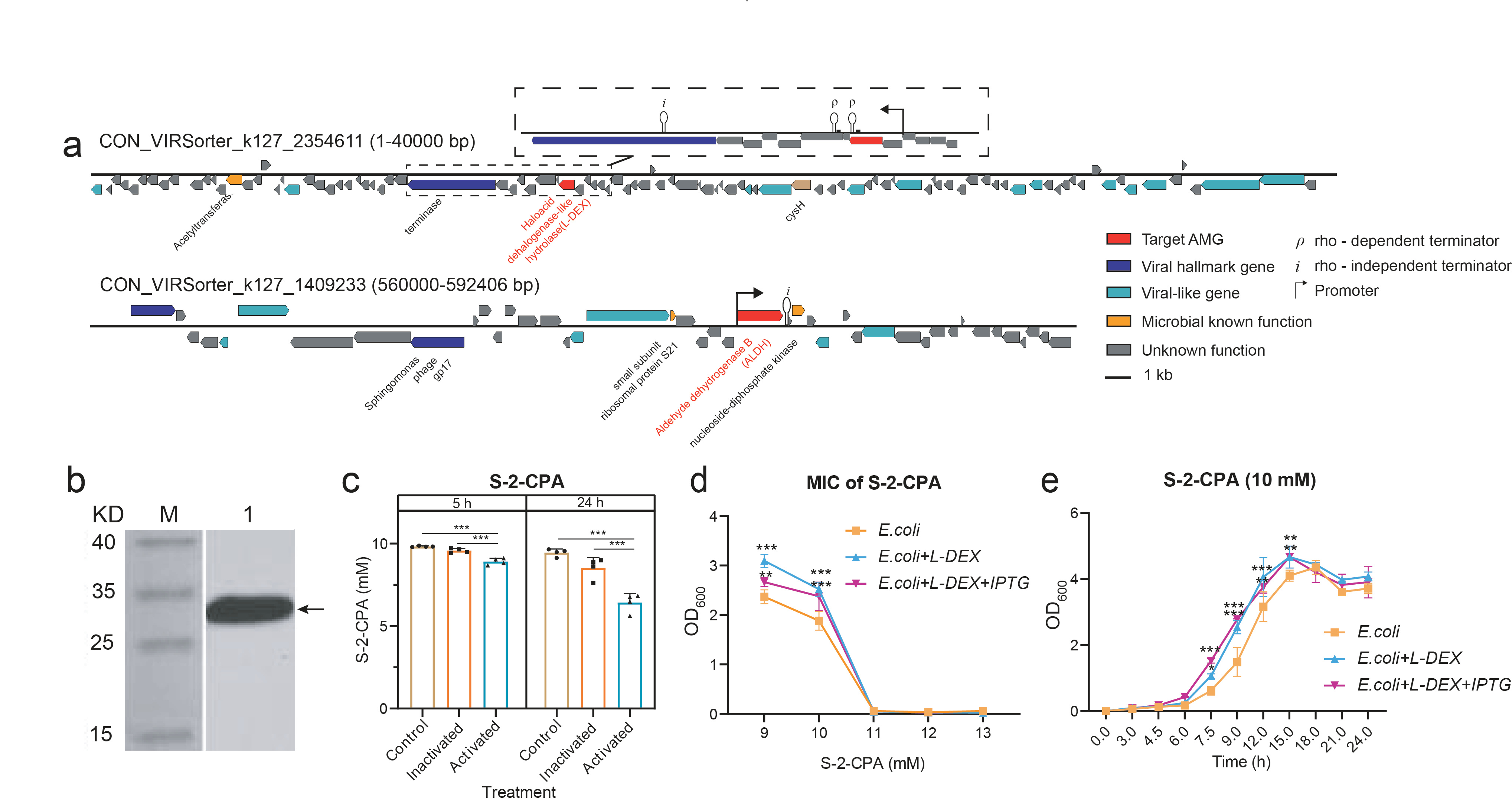 To test this idea experimentally, we focused on the virus-encoded L-2-Haloacid dehalogenase gene (L-DEX), which catalyzes the hydrolytic dehalogenation of L-2-haloacids – important precursors for the synthesis of pesticides, including Hexachlorocyclohexane, which is a persistent organochlorine insecticide. In addition, one of its substrates, 2-chloropropionic acid, is also a commonly used broad-spectrum herbicide. The degradation activity of the purified, virus-encoded L-DEX protein was investigated experimentally (Fig. 3). It was found that L-DEX could break down two haloacid precursors, monochloroacetate (MCA) and S(L)-2-chloropropionic acid (S-2-CPA), leading to detoxification of the environment. Moreover, the presence of L-DEX plasmid allowed E. coli host bacterium to grow better at subinhibitory S-2-CPA concentrations. Together, these results show that virus-encoded L-DEX formed an active protein that was beneficial for the host bacterium by breaking down pesticides and improving its growth.