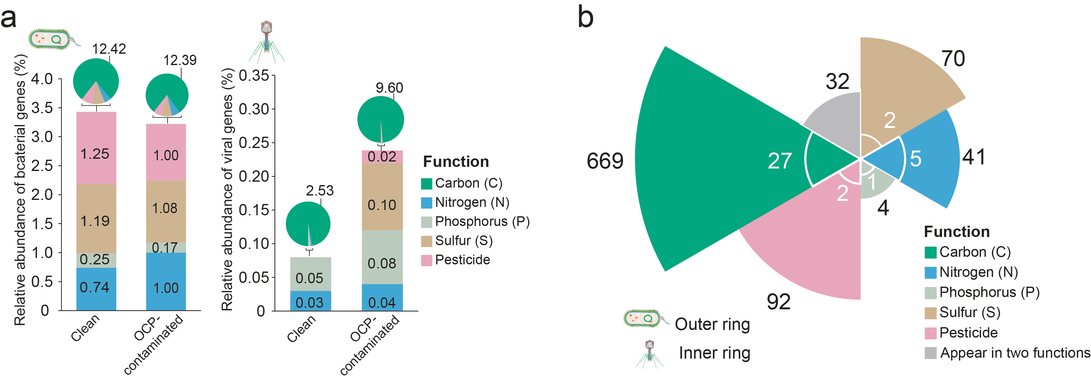 Figure 2. Relative abundances and number of bacterial and virus-encoded genes in clean and OCP-contaminated soils.