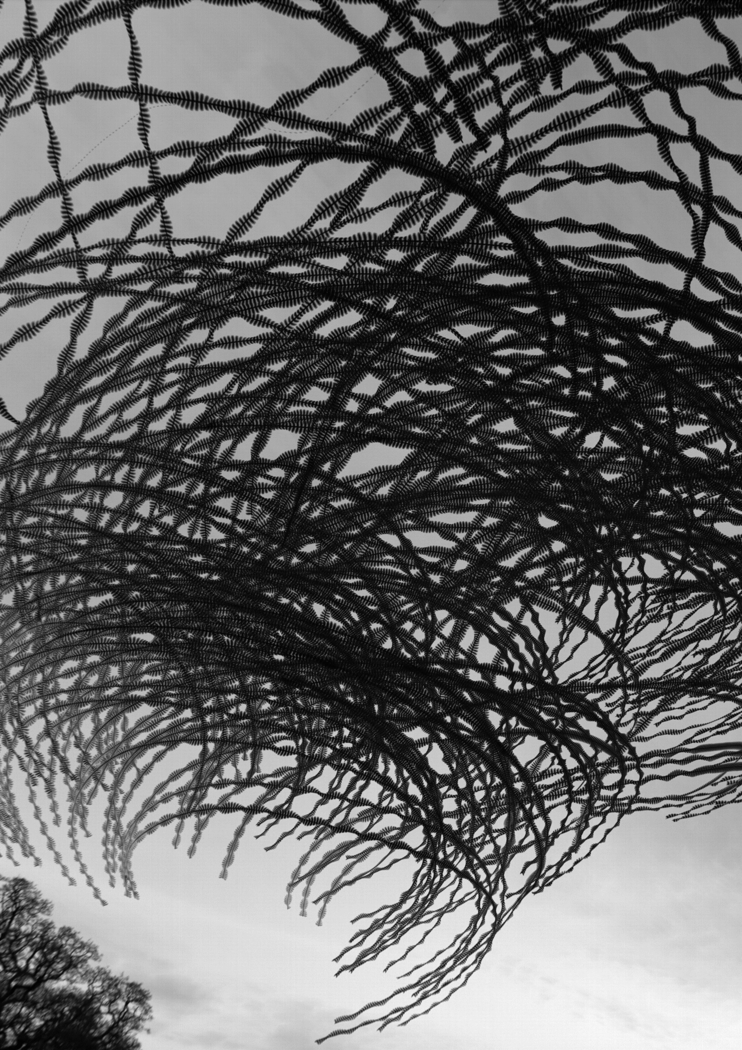 A photograph combining all of the images collected from one camera during the passage of a jackdaw flock. Each ribbon is the path taken by a single bird, with oscillations in the ribbons show the wingbeats of each individual. Image by Hangjian Ling.