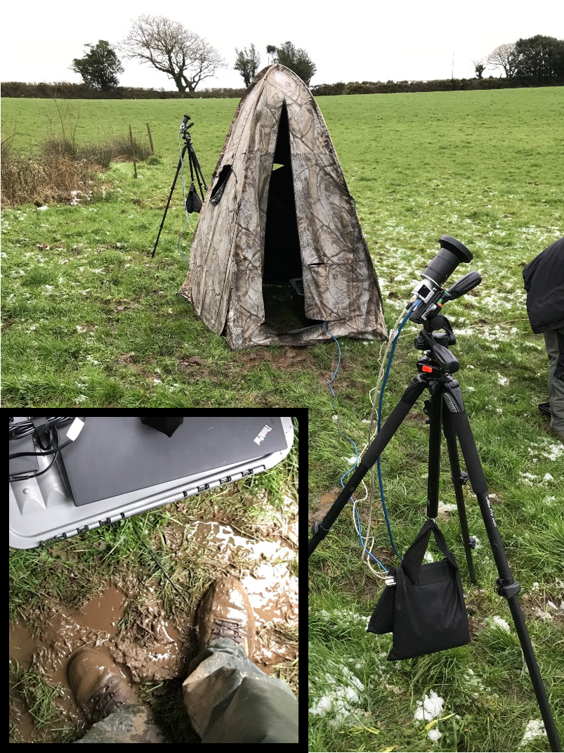The challenges of studying collective behaviour of jackdaws in the field are great. To record and reconstruct the trajectories of flock members in three-dimensional space with high-precision, we had to capture the area of sky that the birds pass through on at least 3 cameras that work in synchrony. Addressing this challenge required a truly interdisciplinary collaboration, combining our biological knowledge of the study system with the expertise of physicists Hangian Ling and Nicholas Ouellette from the the Environmental Complexity Lab at Stanford University. Together, we have developed and deployed an array of 4 cameras in the English countryside over the last two winters, allowing us to film large flocks of corvids (members of the crow family) as they commute to their evening roosts(6). Using high-speed USB cameras that write to high-performance laptops allows us to capture up to 80 frames per second, and film for over 2 minutes at a time. Modern stereo-imaging hardware provides a great advance upon some of the pioneering work in this field, where synchronised film cameras could capture 36 images at around 1.5 images per second(7).