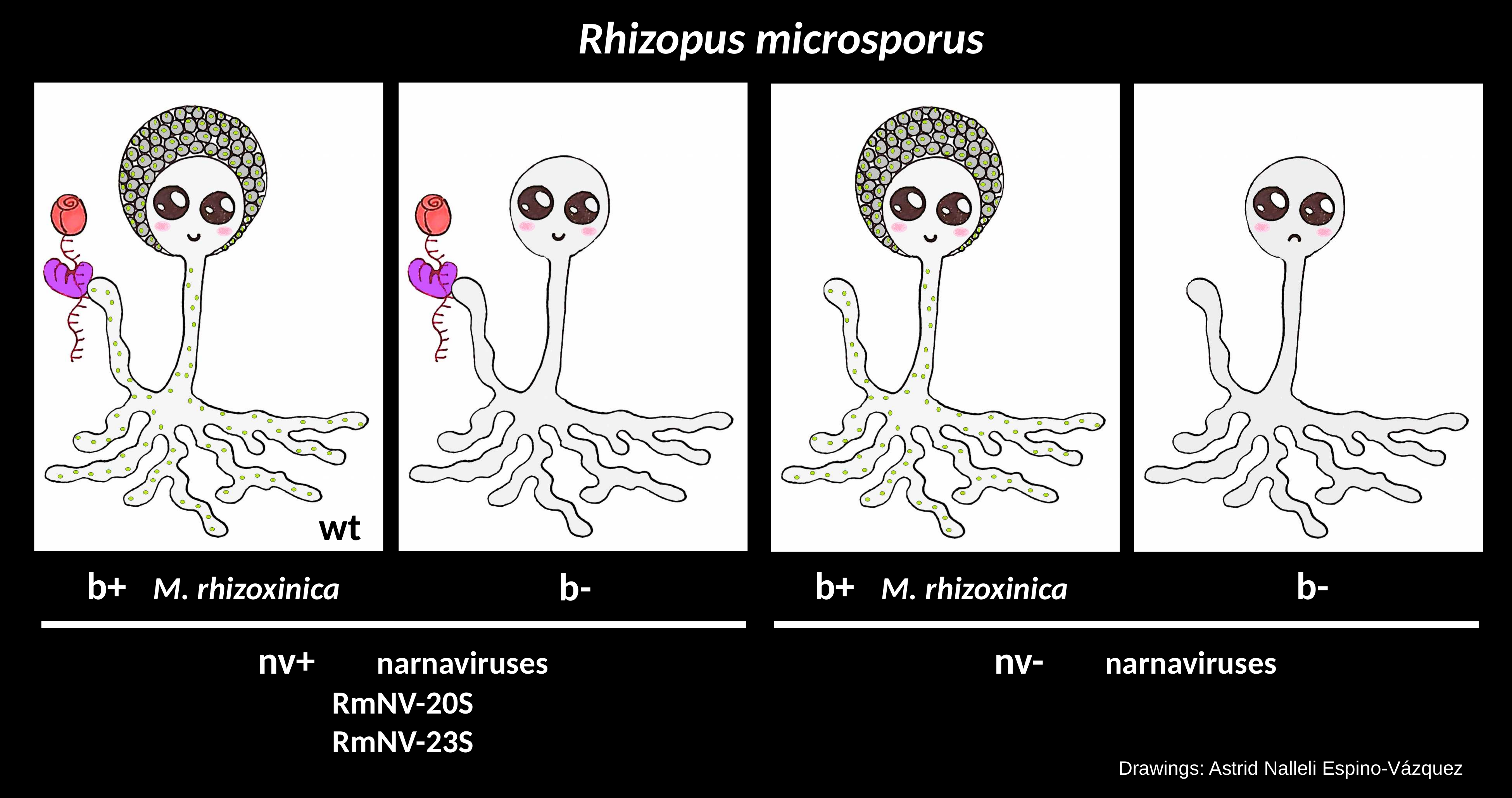 Last and most importantly, we were capable of eliminating these two narnaviruses in Rhizopus. The process of curing viruses in this fungus has been much more complicated and tedious than the clearance of bacteria. Additionally, to discard the non-target effects of antivirals, we used two chemicals -ribavirin and cycloheximide- to get several narnaviruses-free strains in the same fungal genetic background. In this manner, we ensured that the observed phenotypes were due to the lack of narnaviruses and not to the antiviral treatments. These experiments allowed us to conclude that narnaviruses reduce the amount of asexual sporagiospores, but together with symbiotic Mycetohabitans, are required for a successful sex life!