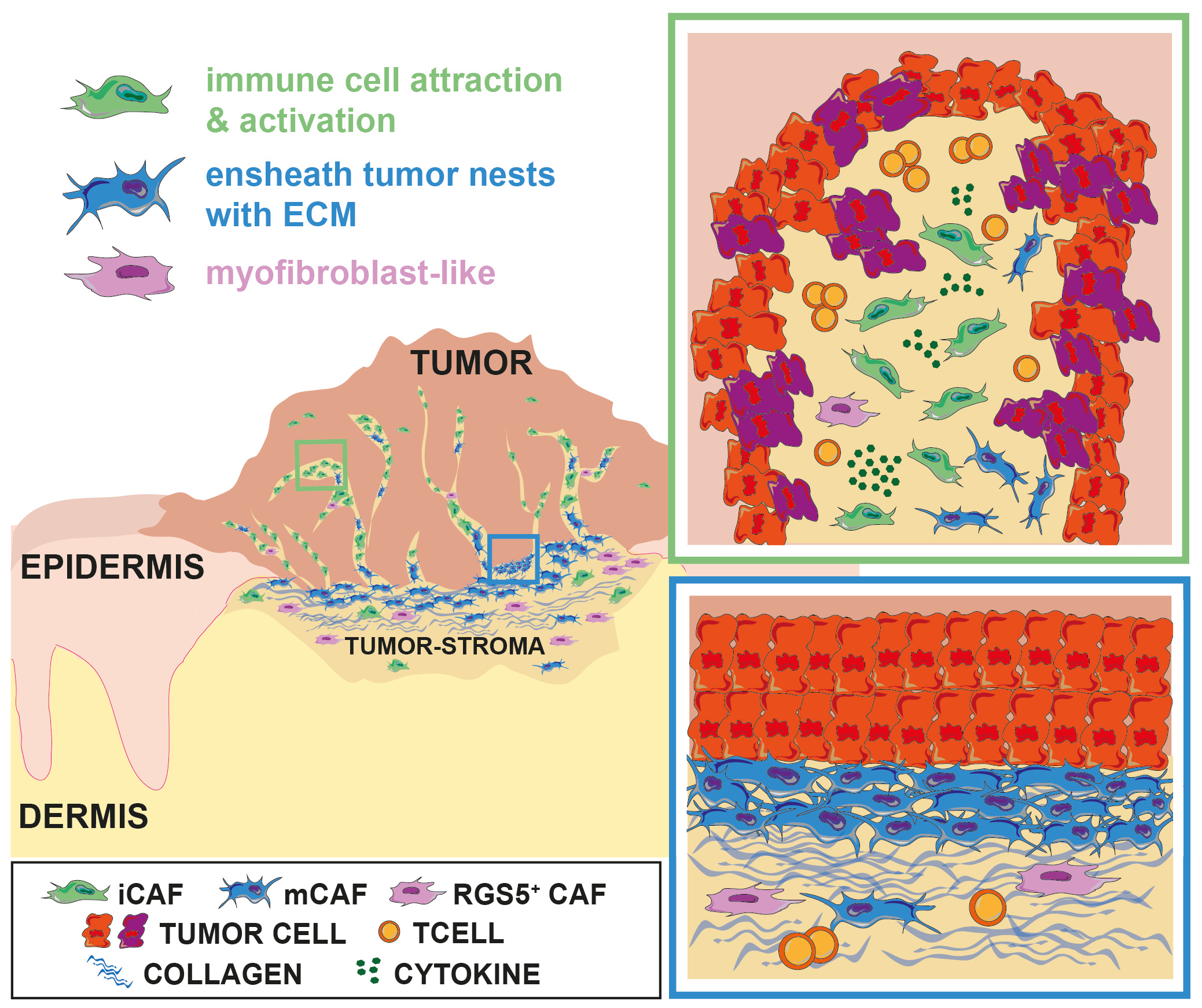- Distinct localization of CAF subsets: Intriguingly, large-field spatial visualization of the CAF subpopulations in tumor tissue of a large cohort of patients with different skin cancer subtypes revealed that the localization of the three CAF subtypes was different. While RGS5+ CAFs were detected throughout the tumors, mCAFs were predominately located at the tumor-stroma border, ensheathing tumor nests, and iCAFs were pervading the tumors in patches. The strong tumor-border association of mCAFs suggested a barrier function for this subtype. Indeed, image analysis showed that a dense mCAF barrier surrounding tumor nests prevented T cell infiltration, despite the presence of large numbers of T cells in the surrounding stroma, suggesting that mCAFs play a key role in immune cell marginalization within tumors.