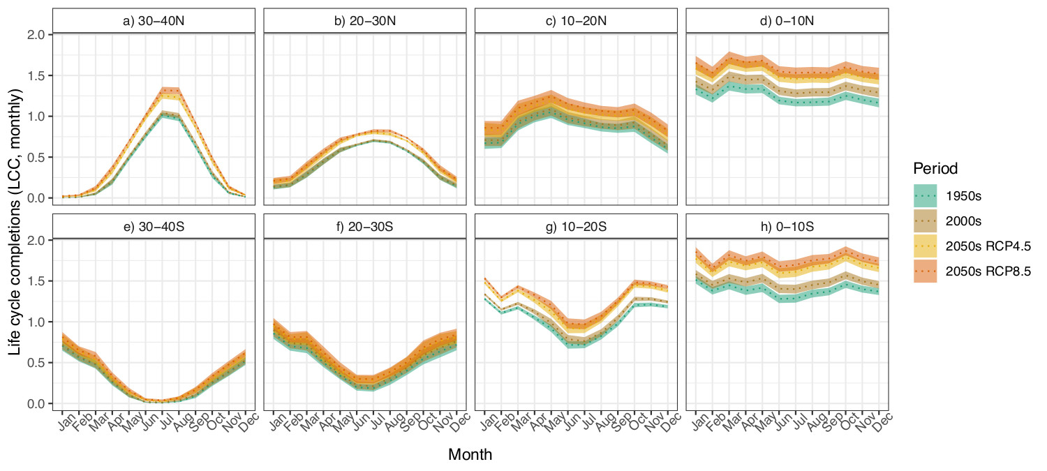 GDDs basically tell us how many days an arthropod species requires under a certain temperature to grow and complete each stage of its life cycle. By feeding the model with different temperature and rainfall data (we used daily gridded data for the whole world at 30x30km from 1950-2050 under two different greenhouse gas emissions scenarios), we assessed how fast this species should be able to grow and thus how many generations it could achieve (we call this ‘life cycle completions (LCC)’) in any given location and how this might be changing through time.