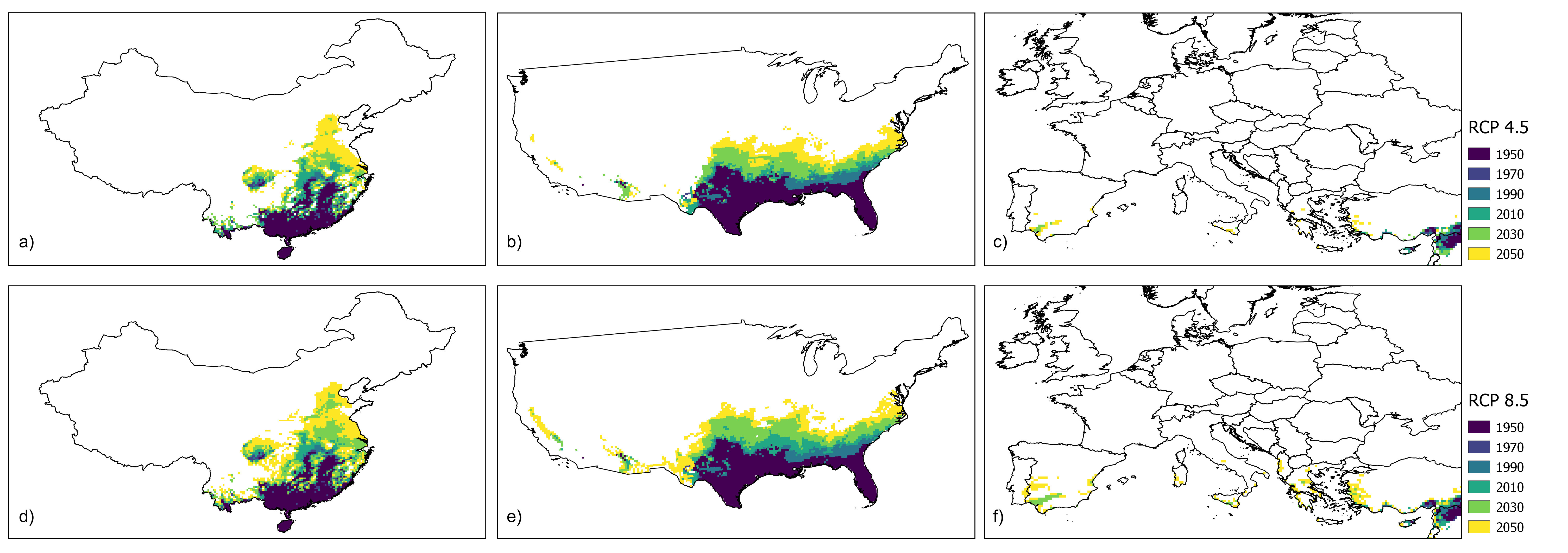2. Advancement of invasion frontiers in China, USA, and Europe. Our results indicate that invasion frontiers of A. aegypti in China and USA will advance 2.4-3.5 times faster by 2050 (~6.0km/yr) than historically observed (1950-2000). Europe is expected to experience sustained suitability for A. aegypti in Spain, Portugal, Greece and Turkey by 2030.
