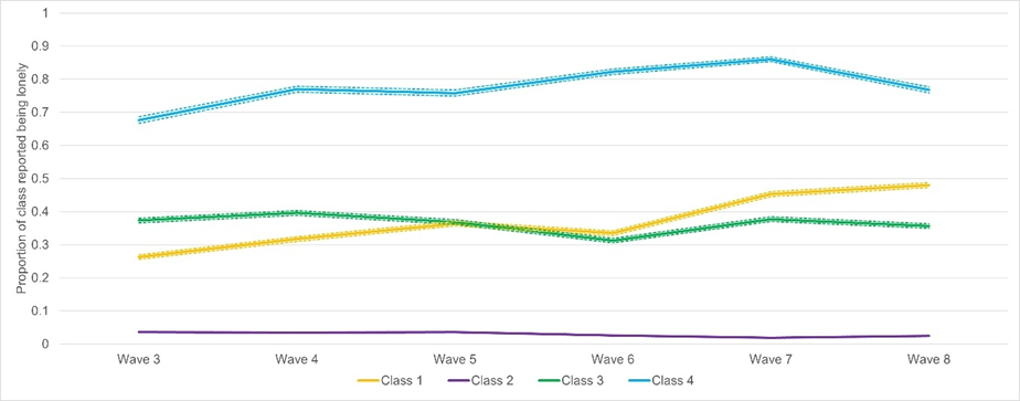 Class 1 = ‘Increasing’ loneliness; Class 2 = ‘Stable-low’ loneliness; Class 3 = ‘Stable-medium’ loneliness; Class 4 = ‘Stable-high’ loneliness