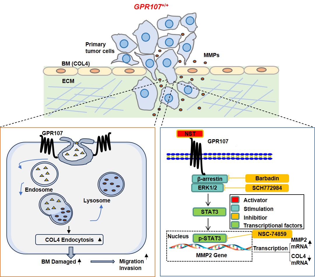 In conclusion, our work elevates GPR107 from an orphan receptor to a central regulator of breast cancer metastasis. By unveiling its multi-faceted attack on collagen IV and delineating the underlying β-arrestin/ERK/STAT3 mechanism, we provide a new framework for understanding tumour cell invasion. We propose that targeting GPR107 represents a fertile and previously unexplored frontier for developing innovative strategies to predict, prevent, and treat metastatic breast cancer.