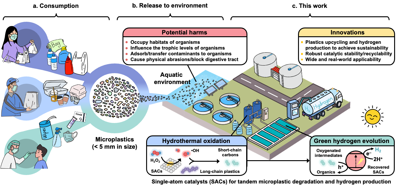 Figure. Plastic consumption, release, and new strategy of microplastics upcycling. a Consumption and generation of microplastic wastes. b Release and potential harms of microplastic wastes. c, Proposed strategy of a tandem microplastic degradation-hydrogen evolution reaction (MPD-HER) process.